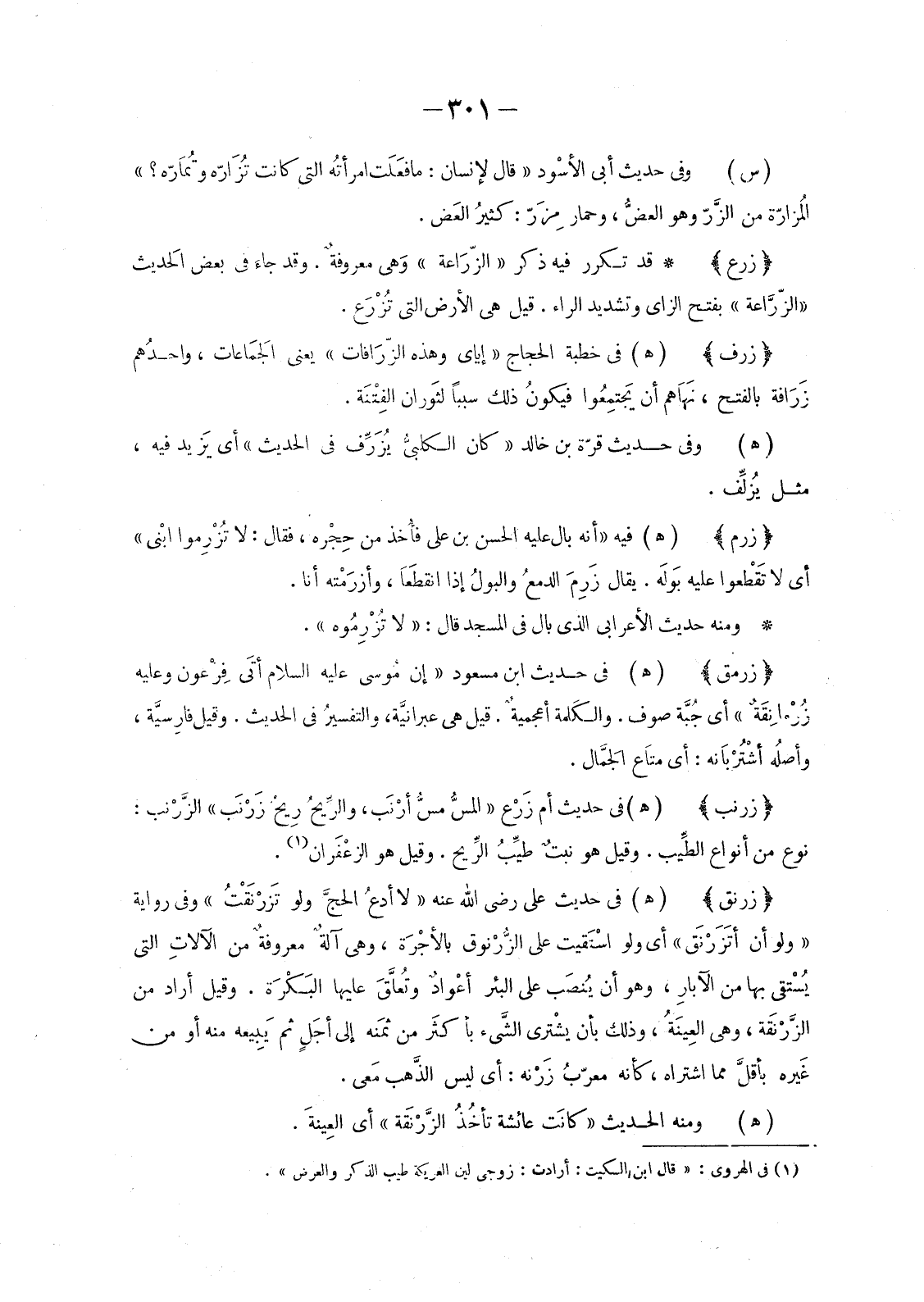 (هـ) وَفِي حَدِيثِ قُرَّةَ بْنِ خَالِدٍ «كَانَ الكلبيُّ يُزَرِّفُ فِي الْحَدِيثِ» أَيْ يَزيد فِيهِ، مِثْلَ يُزلِّف.