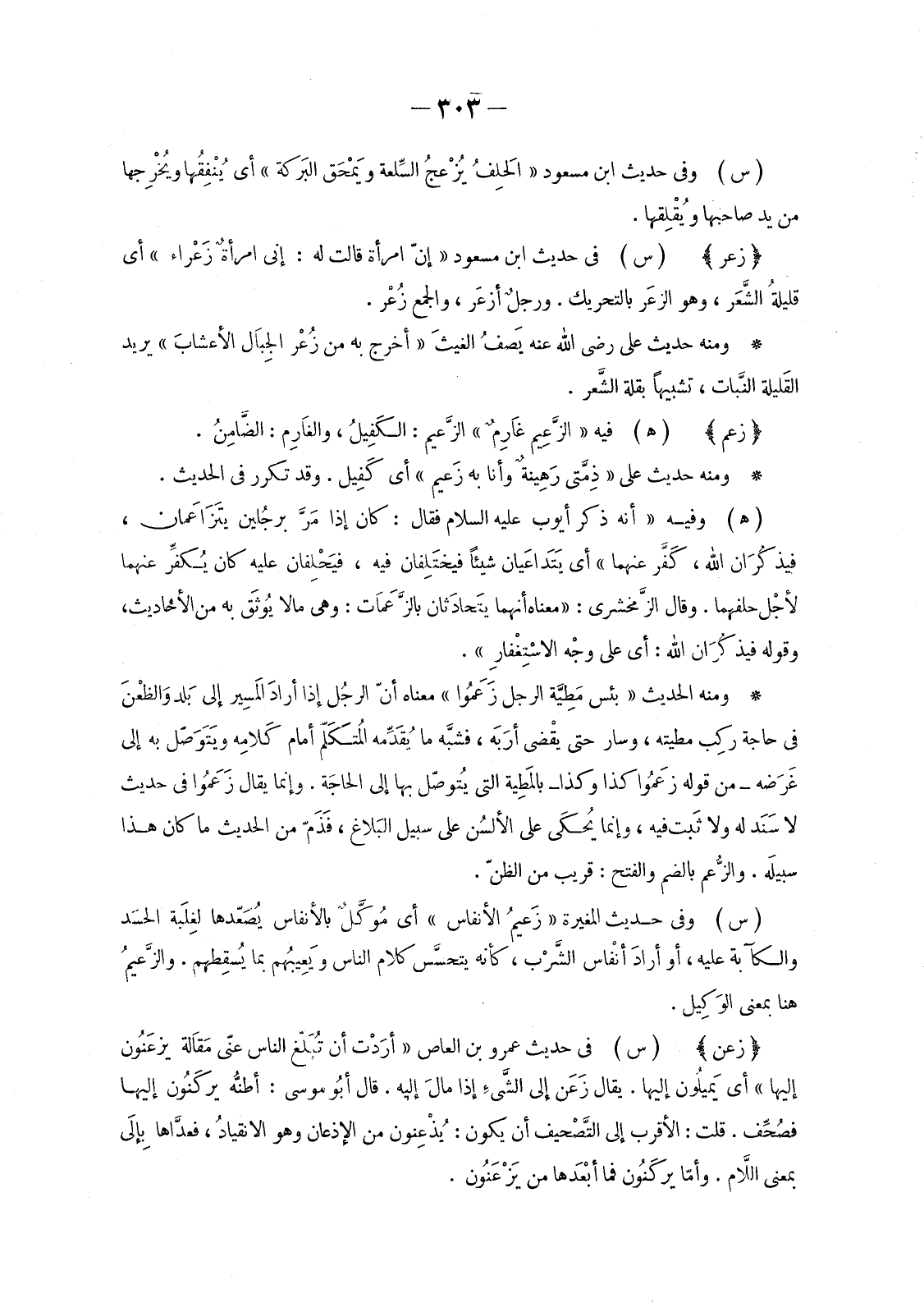 وَمِنْهُ الْحَدِيثُ «بِئْسَ مَطيَّة الرَّجُلِ زَعَمُوا» مَعْنَاهُ أَنَّ الرجُل إِذَا أرادَ المَسِير إِلَى بَلد وَالظْعنَ فِي حَاجَةٍ ركِب مَطِيَّتَهُ، وَسَارَ حَتَّى يقْضي أرَبَه، فشبَّه مَا يُقَدِّمه المُتكَلّم أَمَامَ كَلامِه ويَتَوَصَلّ بِهِ إِلَى غَرَضه- مِنْ قَوْلِهِ زَعمُوا كَذَا وَكَذَا- بالمَطِية الَّتِي يُتوصّل بِهَا إِلَى الحاجَة. وَإِنَّمَا يُقَالُ زَعَمٌوا فِي حَدِيثٍ لَا سَنَد لَهُ وَلَا ثَبت فِيهِ، وَإِنَّمَا يُحكَى عَلَى الْأَلْسُنِ عَلَى سَبِيلِ الْبَلَاغِ، فَذَمَّ مِنَ الْحَدِيثِ مَا كَانَ هَذَا سبيلَه. والزُّعْمُ بِالضَّمِّ وَالْفَتْحِ: قَرِيبٌ مِنَ الظَّنِّ.