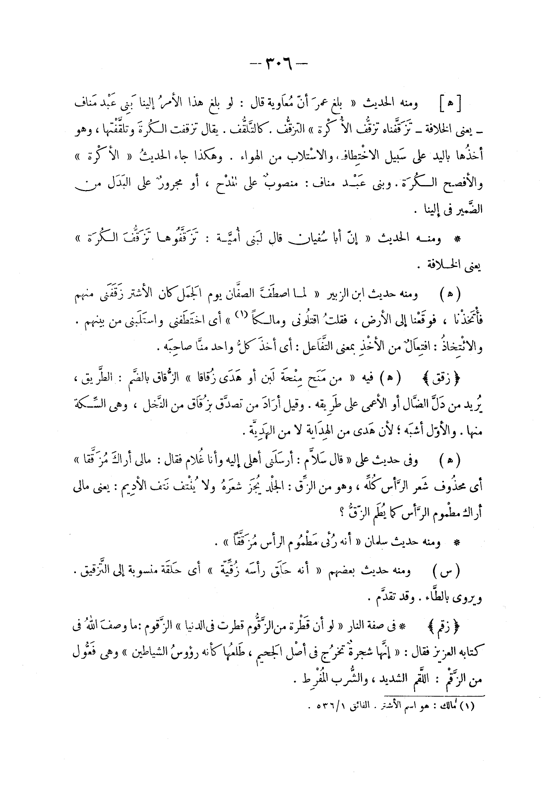 [هـ] وَمِنْهُ الْحَدِيثُ «بَلَغَ عمرَ أَنَّ مُعاَوية قَالَ: لَوْ بَلَغَ هَذَا الأمرُ إِلَيْنَا بَنِى عَبْد مَناف- يَعْنِي الْخِلَافَةَ- تَزَقَّفْنَاهُ تَزَقُّفَ الأُكْرة» التَّزَقُّفُ. كالتَّلقُّف. يُقَالُ تَزَقَّفْتُ الكُرةَ وتلقَّفْتها، وَهُوَ أخذُها بِالْيَدِ عَلَى سَبيل الاخْتِطاف والاسْتلاب مِنَ الْهَوَاءِ. وَهَكَذَا جَاءَ الحديثُ «الأكْرة» وَالْأَفْصَحُ الكُرَة. وَبَنِي عَبْد مَنَافٍ: منصوبٌ عَلَى المدْح، أَوْ مجرورٌ عَلَى البَدَل مِنَ الضَّمير فِي إِلَيْنَا.