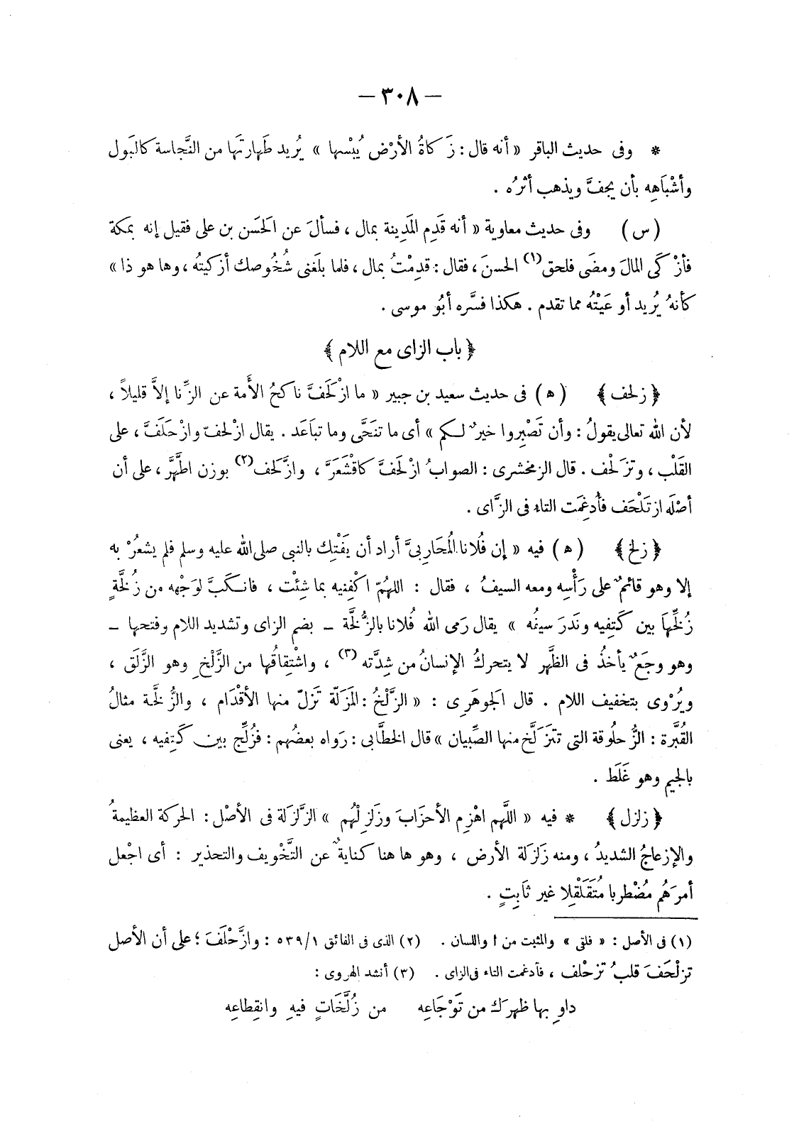 (2) الذي في الفائق 1/ 539: وازَّحْلَفَ؛ على أن الأصل تزلْحَفَ قلبُ تزحْلف، فأُدغمت التاء في الزاى.
