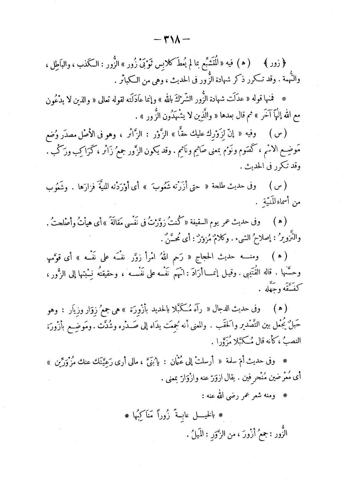 (هـ) فِيهِ «المُتَشَبِّع بِمَا لَمْ يُعْطَ كلاَبس ثَوْبَيْ زُورٍ» الزُّورُ: الكَذب، والباَطِل، والتُّهمة. وَقَدْ تَكَرَّرَ ذِكْرُ شَهَادَةِ الزُّور فِي الْحَدِيثِ، وَهِيَ مِنَ الْكَبَائِرِ.