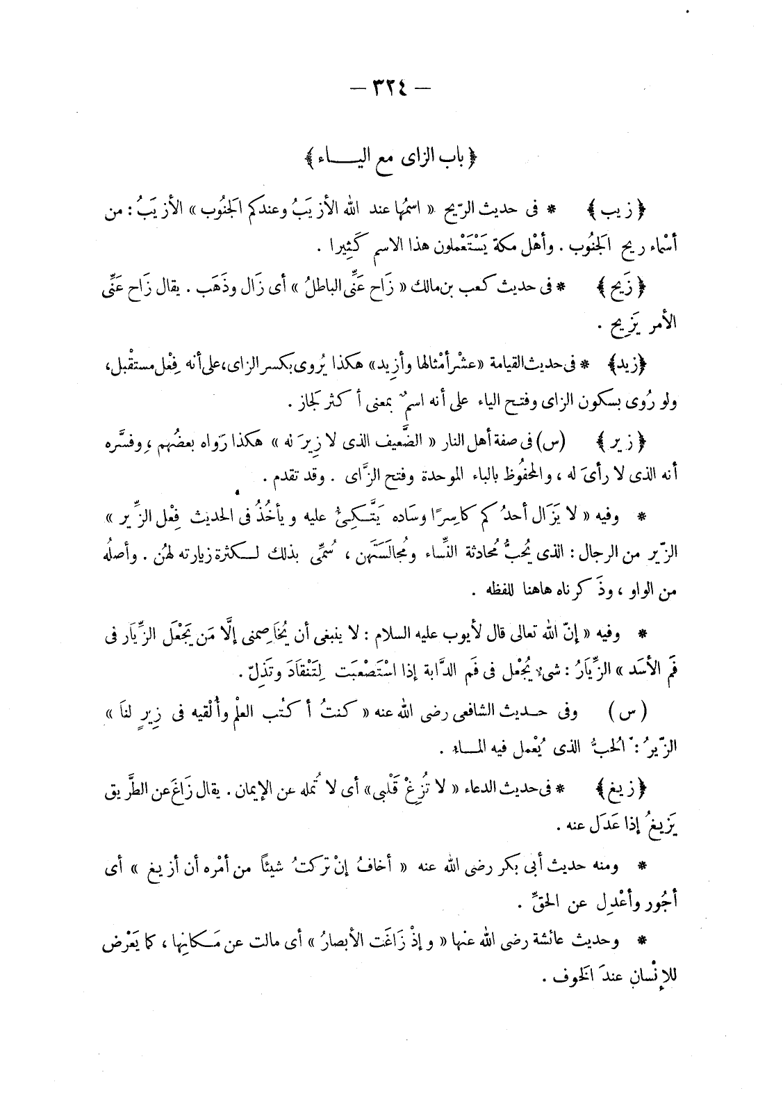 وَفِيهِ «لَا يَزَالُ أَحَدُكُمْ كَاسِرًا وِسَادَهُ يَتَّكِئُ عَلَيْهِ ويأخُذُ فِي الْحَدِيثِ فِعْل الزِّير» الزِّيرُ مِنَ الرِّجَالِ: الَّذِي يُحبُّ مُحَادَثَةَ النِّساء ومُجالَسَتَهن، سُمِّى بِذَلِكَ لِكَثْرَةِ زِيَارَتِهِ لهُن. وأصلُه مِنَ الْوَاوِ، وَذَكَرْنَاهُ هَاهُنَا لِلَفْظِهِ.