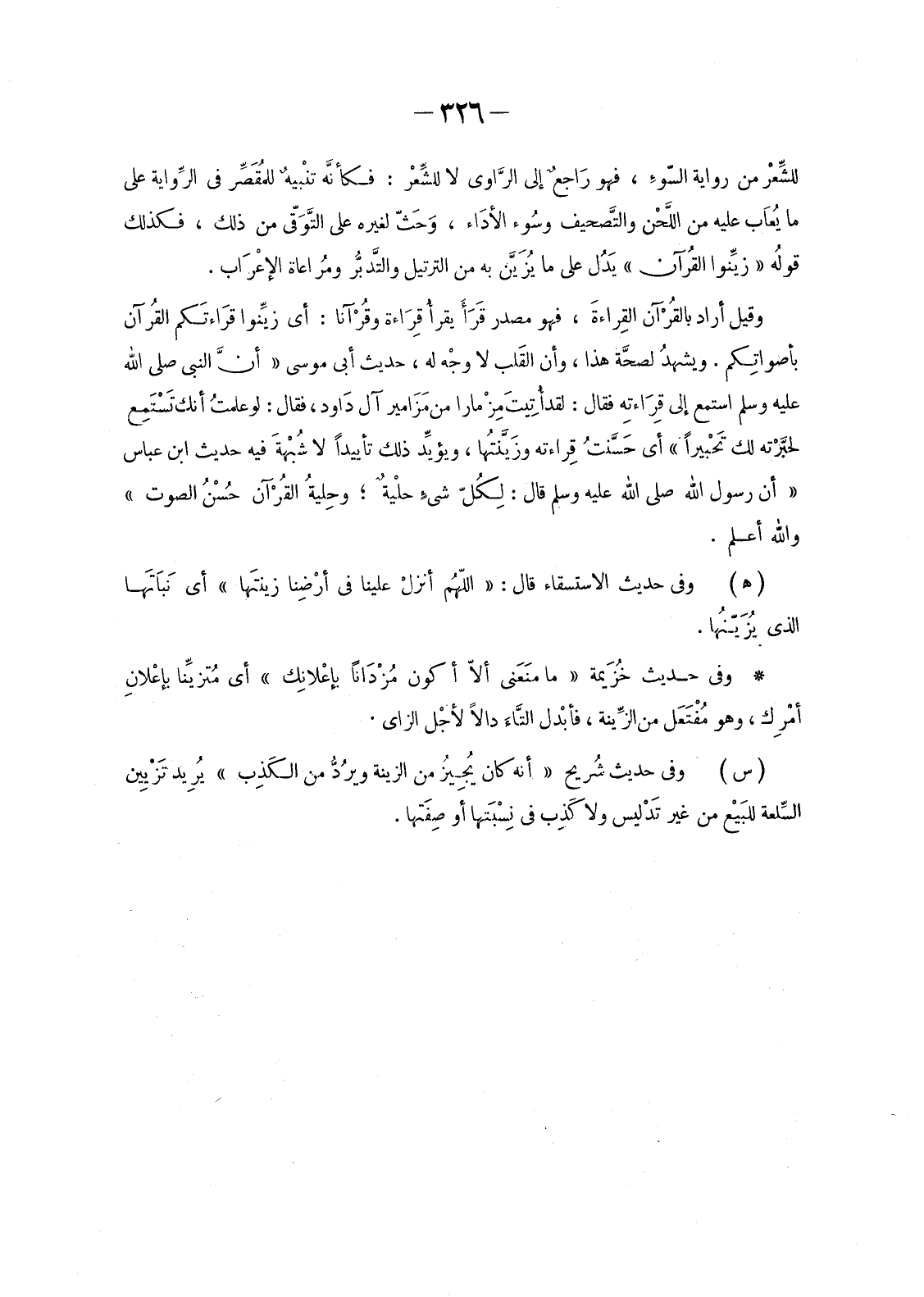 وَقِيلَ أَرَادَ بالقُرْآن القِراءةَ، فَهُوَ مَصْدَرُ قَرَأَ يقرأُ قِرَاءة وقُرْآنا: أَيْ زيَّنوا قرَاءتَكم القُرآن بأصواتِكم. ويشهدُ لصحَّة هَذَا، وَأَنَّ القَلب لَا وجْه لَهُ، حَدِيثُ أَبِي مُوسَى «أنَّ النَّبِيَّ صَلَّى اللَّهُ عَلَيْهِ وَسَلَّمَ اسْتَمَعَ إِلَى قِرَاءتِه فَقَالَ: لَقَدْ أُتِيتَ مِزْمارا مِنْ مَزَامير آلِ دَاود، فَقَالَ: لَوْ علمتُ أَنَّكَ تَسْتَمِع لحبَّرْته لَكَ تَحْبيراً» أَيْ حَسَّنتُ قِراءته وزَيَّنتُها، ويؤيِّد ذَلِكَ تَأْيِيدًا لَا شُبْهةَ فِيهِ حَدِيثُ ابْنِ عَبَّاسٍ «أَنَّ رَسُولَ اللَّهِ صَلَّى اللَّهُ عَلَيْهِ وَسَلَّمَ قَالَ: لِكُلّ شىءٍ حلْيةٌ؛ وحِليةُ القُرْآن حُسْنُ الصَّوْتِ» وَاللَّهُ أَعْلَمُ.