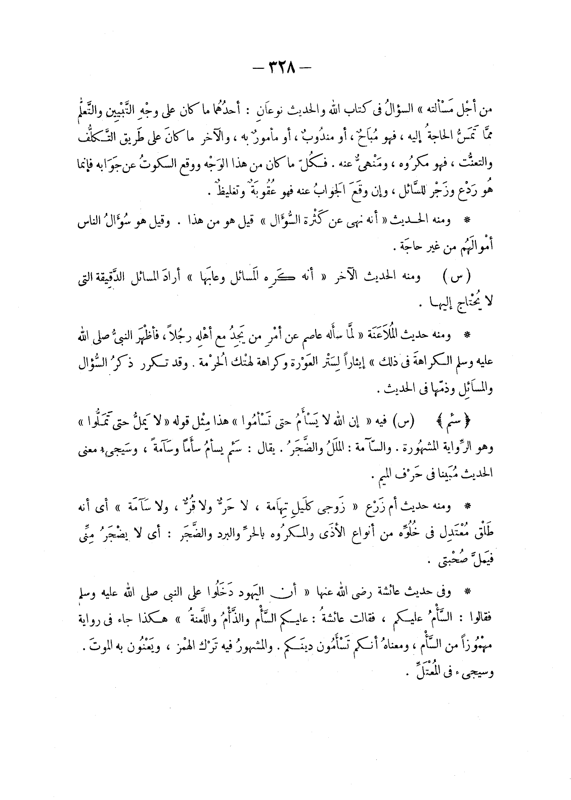 مِنْ أجْل مَسْأَلَتِهِ» السُّؤَالُ فِي كِتَابِ اللَّهِ وَالْحَدِيثِ نوعَانِ: أحدُهُما مَا كَانَ عَلَى وجْهِ التَّبْيِين والتَّعلُّم ممَّا تَمَسُّ الحاجةُ إِلَيْهِ، فَهُوَ مُباَحٌ، أَوْ مندُوبٌ، أَوْ مأمورٌ بِهِ، وَالْآخَرُ مَا كانَ عَلَى طَريق التَّكلُّف والتعنُّت، فَهُوَ مكرُوه، ومَنْهىٌّ عَنْهُ. فكُلّ مَا كَانَ مِنْ هَذَا الوَجْه وَوَقَعَ السكوتُ عَنْ جَوَابه فَإِنَّمَا هُو رَدْع وزَجْر للسَّائل، وَإِنْ وقَعَ الجَوابُ عَنْهُ فَهُوَ عُقُوبَةٌ وتغليظٌ.