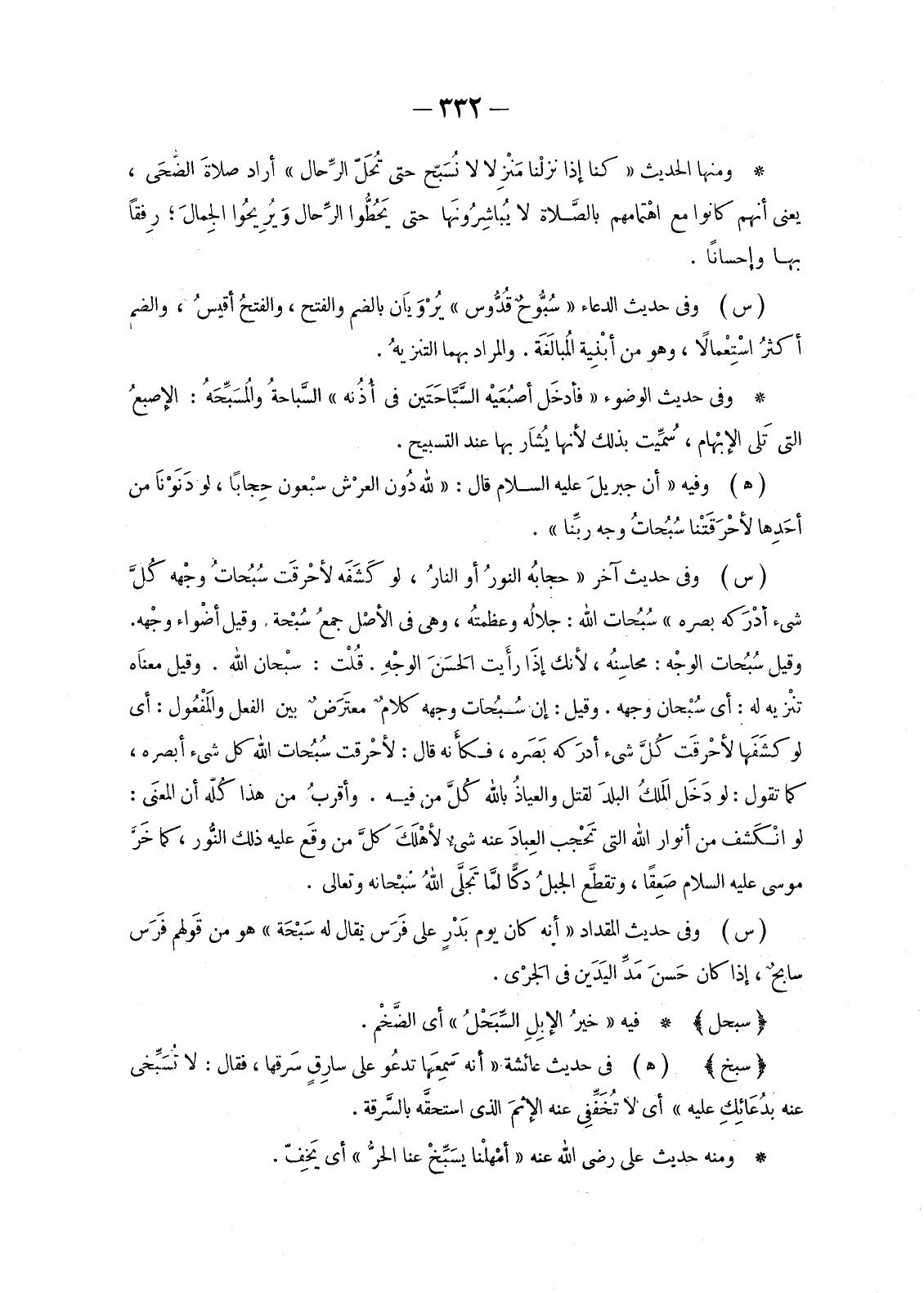 وَقِيلَ سُبُحَاتُ الوجْه: محاسِنُه، لِأَنَّكَ إذَا رأَيت الحَسَنَ الوجْهِ. قُلْت: سُبْحَانَ اللَّهِ. وَقِيلَ معناَه تنْزيه لَهُ: أَيْ سُبْحَانَ وَجْهِهِ. وَقِيلَ: إِنَّ سُبُحَاتِ وَجْهِهِ كلامٌ معتَرَضٌ بَيْنَ الْفِعْلِ والمَفْعُول: أَيْ لَوْ كشَفها لأحْرقَت كُلَّ شَيْءٍ أدرَكه بَصَره، فكأَنه قَالَ: لأحْرقت سُبُحات اللَّهِ كُلَّ شَيْءٍ أَبْصَرَهُ، كَمَا تَقُولُ: لَوْ دَخَل المَلكُ البلدَ لَقَتَلَ والعياذُ بِاللَّهِ كُلَّ مَنْ فِيهِ. وأقربُ مِنْ هَذَا كُلّه أَنَّ المعنَى: