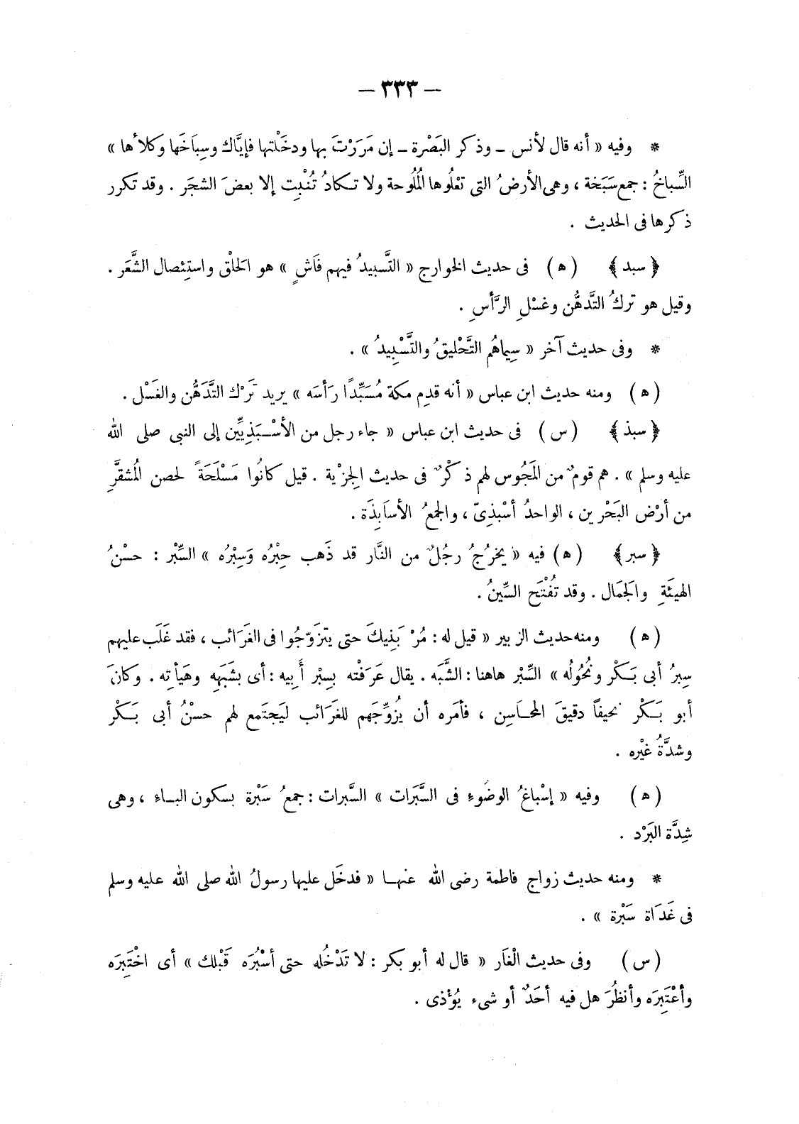 وَفِيهِ «أَنَّهُ قَالَ لِأَنَسٍ- وَذَكَرَ البَصْرة- إِنْ مَرَرْت بِهَا ودخَلْتها فإيَّاك وسِبَاخَهَا وَكَلَأَهَا» السِّبَاخُ: جَمْعُ سَبَخَة، وَهِيَ الأرضُ الَّتِي تعْلُوها المُلُوحة وَلَا تكادُ تُنْبِت إِلَّا بعضَ الشجَر. وَقَدْ تَكَرَّرَ ذِكْرُهَا فِي الْحَدِيثِ.