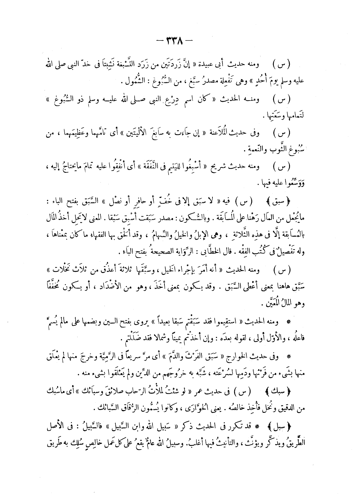 قَدْ تَكَرَّرَ فِي الْحَدِيثِ ذِكْرُ «سَبِيل اللَّهِ وَابْنِ السَّبِيلِ» فَالسَّبِيلُ: فِي الْأَصْلِ الطَّريقُ ويذكَّر ويؤنثَّ، والتأنيثُ فِيهَا أغلبُ. وسَبِيلُ اللَّهِ عامٌّ يقعُ عَلَى كُلِّ عَمل خالِصٍ سُلك بِهِ طَرِيقُ