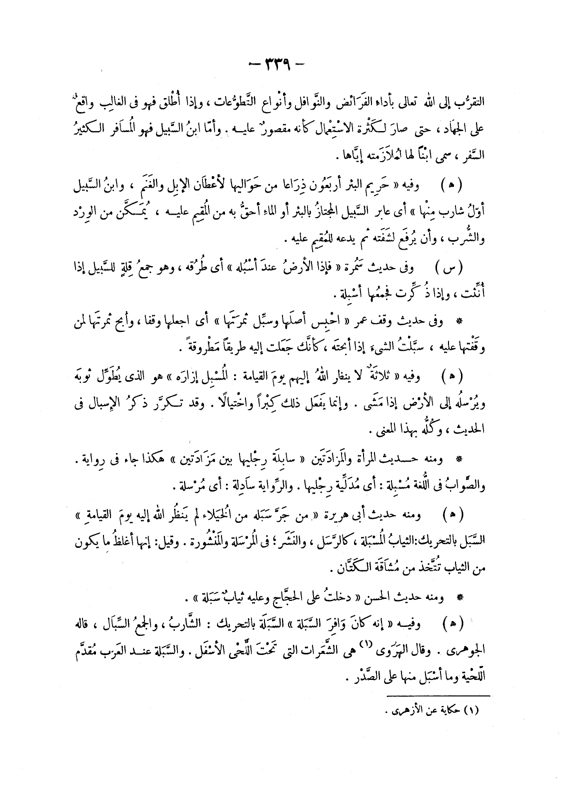 وَفِي حَدِيثِ وَقْفِ عُمَرَ «احْبِس أصلَها وسَبِّلْ ثمرَتَها» أَيِ اجْعَلْهَا وَقْفًا، وَأَبِحْ ثمرتَها لِمَنْ وقَفْتها عَلَيْهِ، سَبَّلْتُ الشىءَ إِذَا أبحتَه، كأنَّك جَعَلت إِلَيْهِ طَرِيقًا مَطْروقةً.