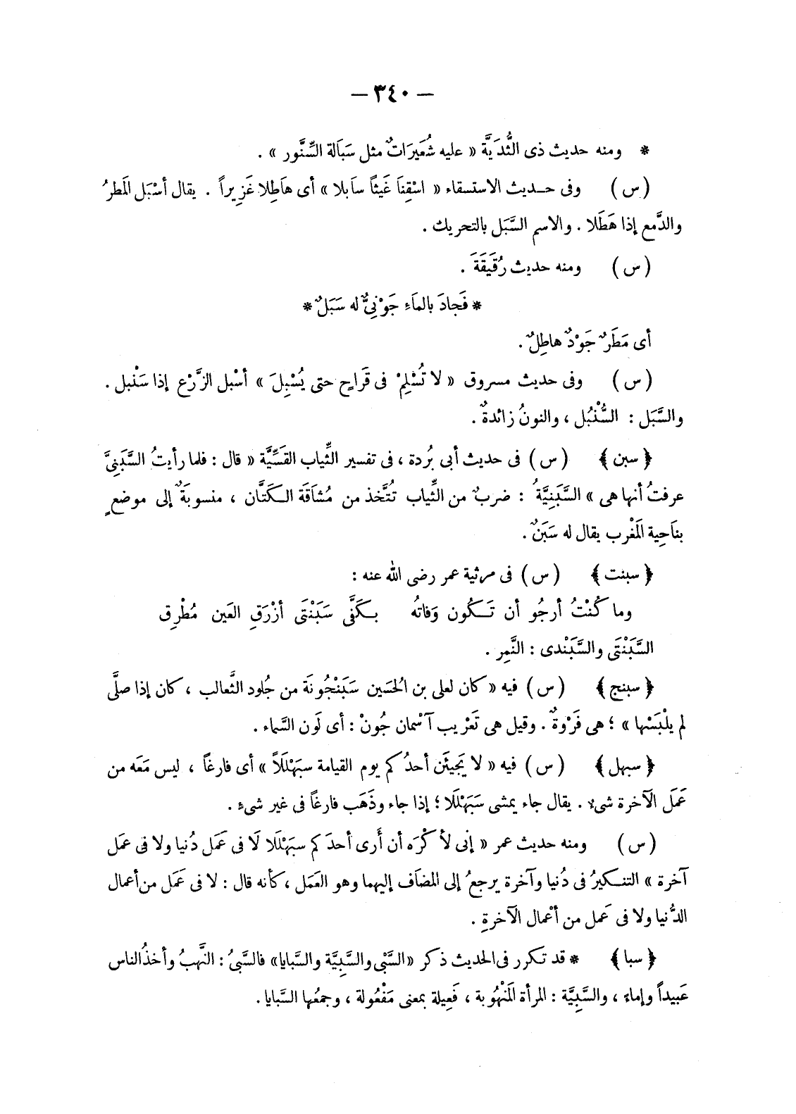 وَمِنْهُ حَدِيثُ ذِي الُّثدَيَّة «عَلَيْهِ شُعَيرَاتٌ مِثْلُ سَبَالَةِ السِّنَّور» .