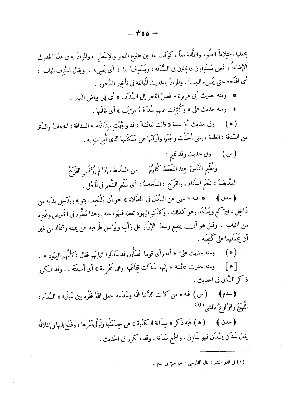 يَجْعَلُهَا اختِلاطَ الضَّوء والظُّلمة مَعًا، كوَقت مَا بَيْنَ طُلُوعِ الْفَجْرِ والإسْفارِ، والمرادُ بِهِ فِي هَذَا الْحَدِيثِ الإضاءةُ، فَمَعْنَى مُسْدِفُونَ داخِلون فِي السُّدْفَةِ، ويُسْدِفُ لَنَا: أَيْ يُضِىءُ. وَيُقَالُ اسْدِفِ الْبَابَ: