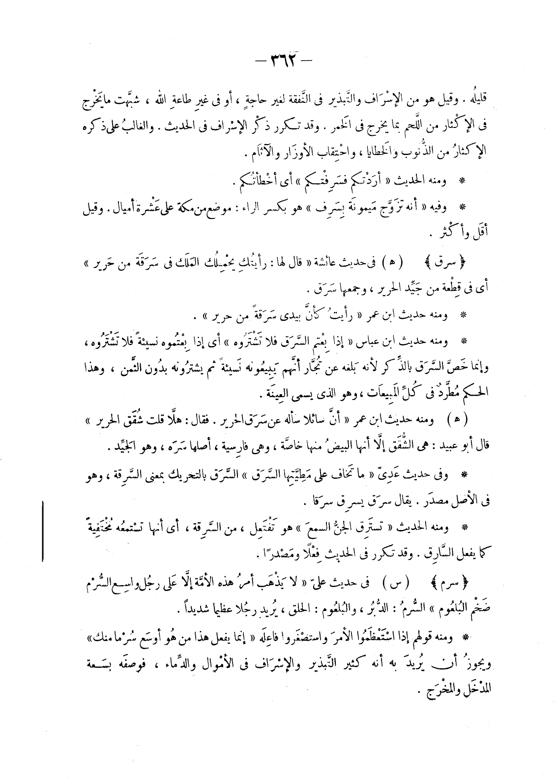 (هـ) وَمِنْهُ حَدِيثُ ابْنِ عُمَرَ «أنَّ سَائِلًا سَأَلَهُ عَنْ سَرَقِ الْحَرِيرِ. فَقَالَ: هلاَّ قُلْتَ شُقَق الْحَرِيرِ» قَالَ أَبُو عُبِيدٍ: هِيَ الشُّقَق إلاَّ أَنَّهَا البيضُ مِنْهَا خاصَّة، وَهِيَ فارِسية، أَصْلُهَا سَرَه، وَهُوَ الجَيِّد.