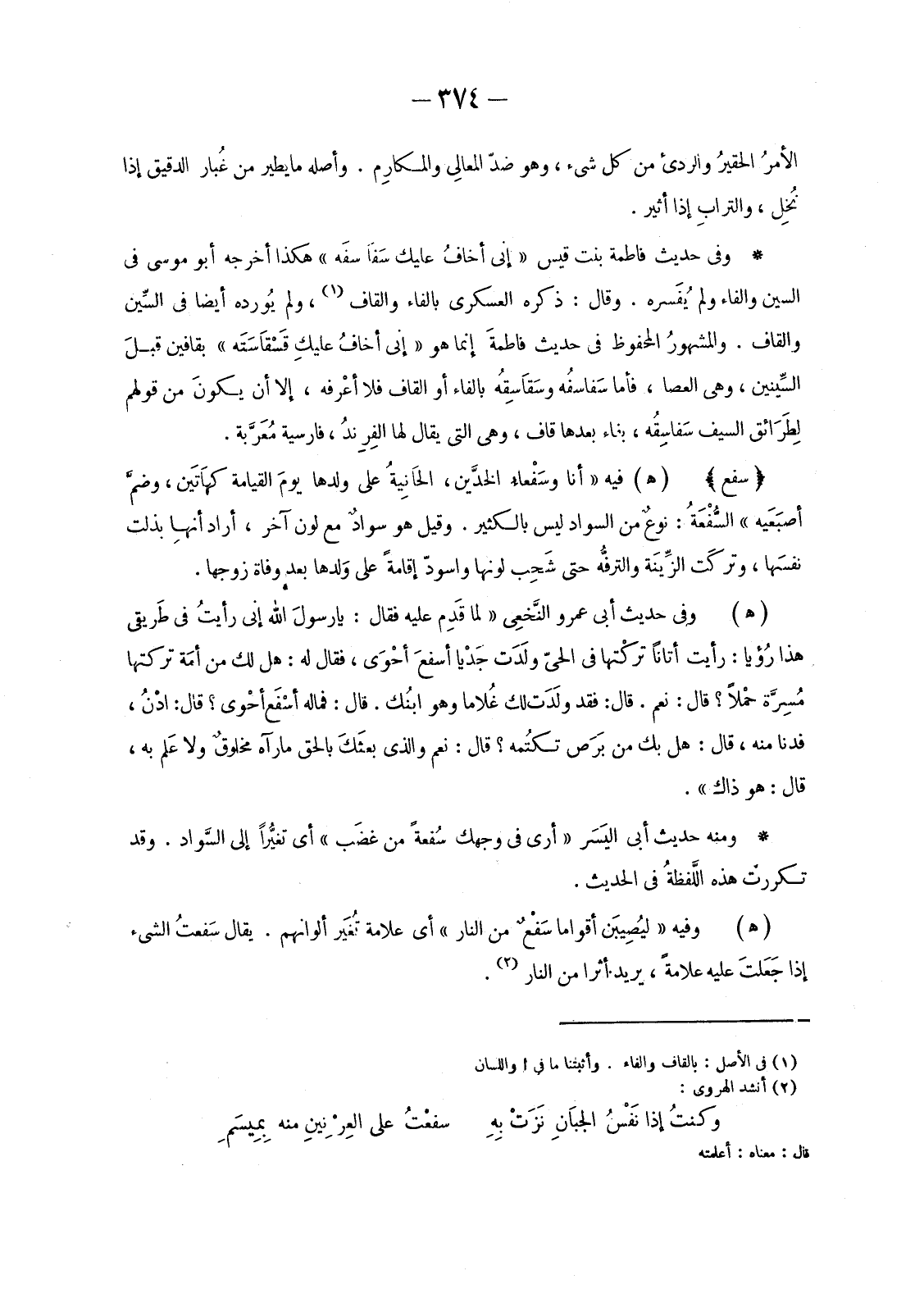 (هـ) فِيهِ «أَنَا وسَفْعَاءُ الْخَدَّيْنِ، الْحَانِيَةُ عَلَى وَلَدِهَا يومَ الْقِيَامَةِ كهَاتَين، وضمَّ أصبَعَيه» السُّفْعَةُ: نوعٌ مِنَ السَّوَادِ لَيْسَ بِالْكَثِيرِ. وَقِيلَ هُوَ سوادٌ مَعَ لَوْنٍ آخَرَ، أَرَادَ أَنَّهَا بَذَلَتْ نفسَها، وتركَت الزِّيّنة والترفُّة حَتَّى شَحِب لَوْنُهَا وَاسْوَدَّ إِقَامَةً عَلَى وَلدها بَعْدَ وَفَاةِ زَوْجِهَا.
