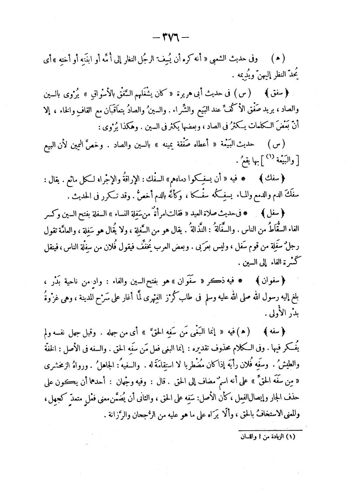 (هـ) فِيهِ «إِنَّمَا البَغْي مَن سَفِهَ الحقَّ» أَيْ مَنْ جَهِلَهُ. وَقِيلَ جَهِلَ نَفْسَهُ وَلَمْ يُفكر فِيهَا. وَفِي الْكَلَامِ مَحْذُوفٌ تَقْدِيرُهُ: إِنَّمَا الْبَغْيُ فِعْلُ مَن سَفِهَ الْحَقَّ. والسَّفَهُ فِي الْأَصْلِ: الْخِفَّةُ والطيشُ. وسَفِهَ فُلان رأيَه إِذَا كَانَ مَضْطربا لَا اسِتقامَةَ لَهُ. والسَّفِيهُ: الجاهلُ. ورواهُ الزَّمَخْشَرِيُّ «مِن سَفَهِ الحقِّ» عَلَى أَنَّهُ اسمٌ مُضَافٌ إِلَى الْحَقِّ. قَالَ: وَفِيهِ وجْهان: أَحَدُهُمَا أَنْ يَكُونَ عَلَى حَذْفِ الْجَارِّ وَإِيصَالِ الفِعل، كَأَنَّ الْأَصْلَ: سَفِه عَلَى الْحَقِّ، وَالثَّانِي أَنْ يُضمَّن مَعْنَى فعْلٍ متعدٍ كجِهل، وَالْمَعْنَى الاستخافُ بِالْحَقِّ، وَأَلَّا يَرَاه عَلَى مَا هُوَ عَلَيْهِ من الرّجحان والرّزانة.