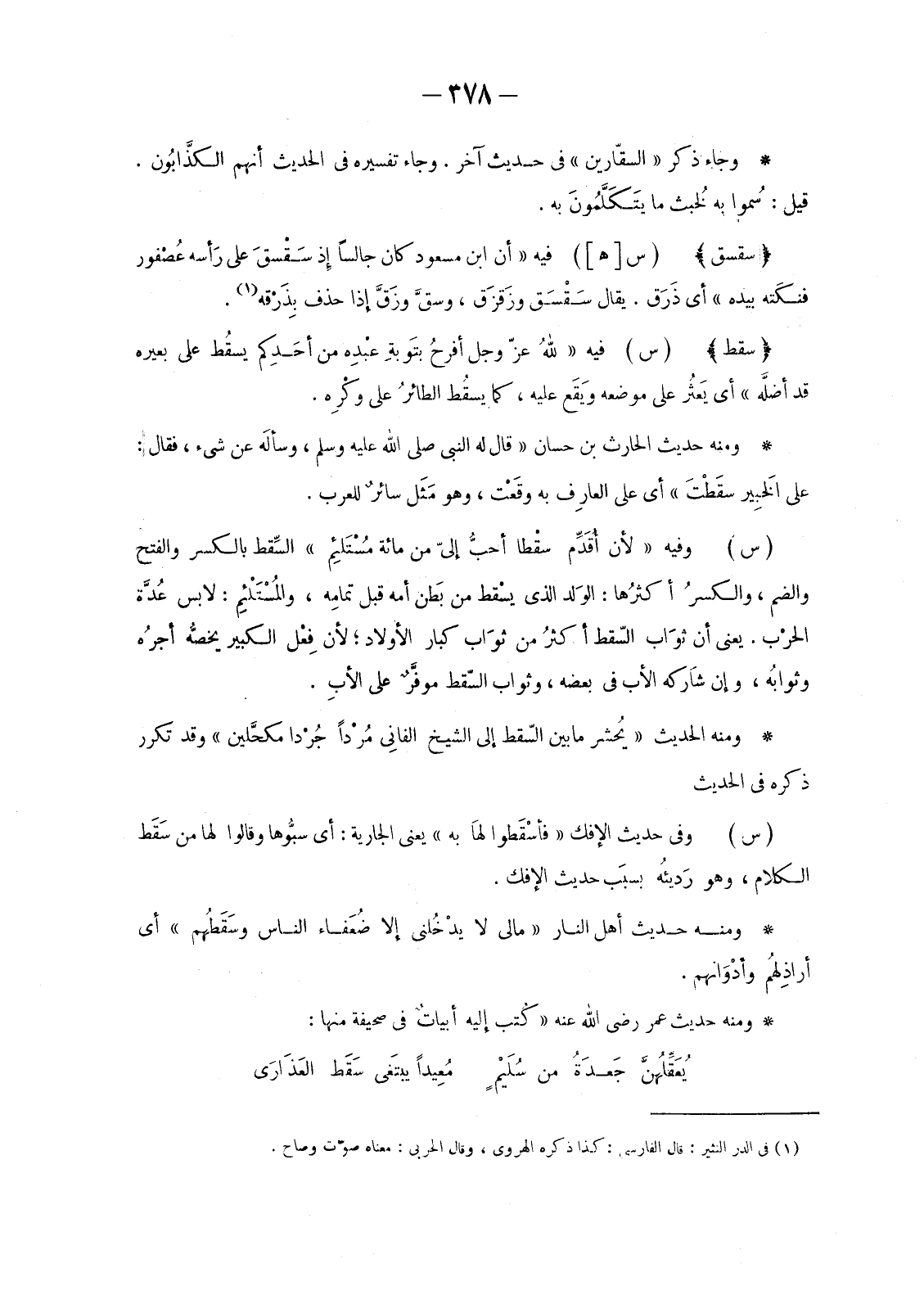 وَمِنْهُ الْحَدِيثُ «يُحشر مَا بَيْنَ السِّقْطِ إِلَى الشَّيْخِ الفانِي مُرْداً جُرْدا مكحَّلين» وَقَدْ تَكَرَّرَ ذِكْرُهُ فِي الْحَدِيثِ (س) وَفِي حَدِيثِ الْإِفْكِ «فَأَسْقَطُوا لهَا بِهِ» يَعْنِي الْجَارِيَةَ: أَيْ سبُّوها وَقَالُوا لَهَا مِنْ سَقَط الْكَلَامِ، وَهُوَ رَديئُه بسبَب حديث الإفك.