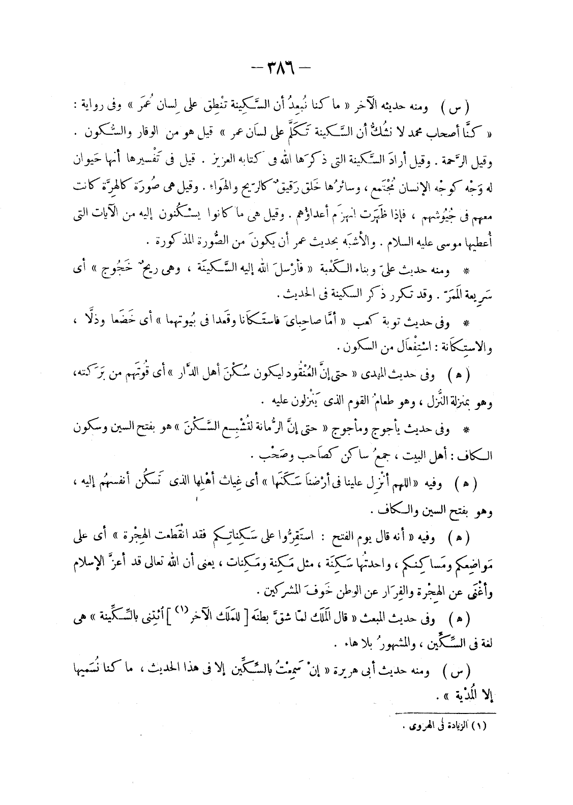 «كنَّا أَصْحَابَ مُحَمَّدٍ لَا نشُكُّ أَنَّ السَّكِينَة تَكَلًّم عَلَى لساَن عُمَرَ» قِيلَ هُوَ مِنَ الْوَقَارِ والسُّكون.