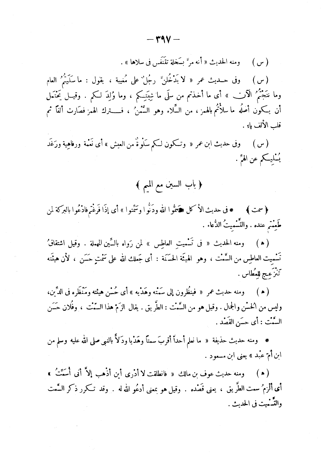 (هـ) وَمِنْهُ الْحَدِيثُ «فِي تَسْمِيتِ العاطِس» لِمَنْ رَواه بالسِّين الْمُهْمَلَةِ. وَقِيلَ اشتقاقُ تَسْمِيتِ العاطِس مِنَ السَّمْتِ، وَهُوَ الهيئَة الحسَنَة: أَيْ جَعلك اللَّهُ عَلَى سَمْتٍ حَسَن، لِأَنَّ هيئَته تَنْزَعِج للِعُطاس.