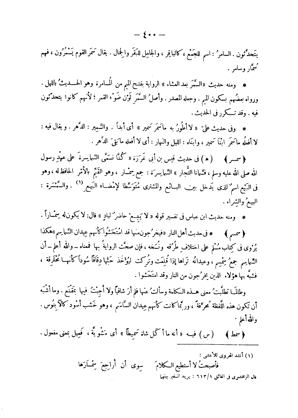 وَمِنْهُ حَدِيثُ «السَّمَرُ بَعْدَ الْعِشَاءِ» الرِّوَايَةُ بِفَتْحِ الْمِيمِ مِنَ المُسَامَرَةِ وَهُوَ الحديثُ بِاللَّيْلِ.
