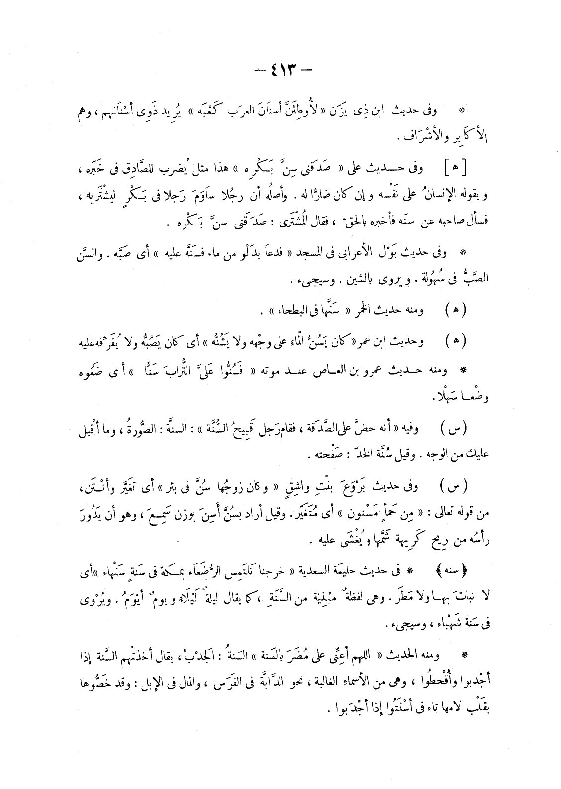 وَفِي حَدِيثِ ابْنِ ذِي يَزَن «لأُوطِئَنَّ أَسْنَانَ العرَب كَعْبَة» يُرِيد ذَوِي أسْناَنهم، وَهُمُ الأكَابِر والأشْرَاف.