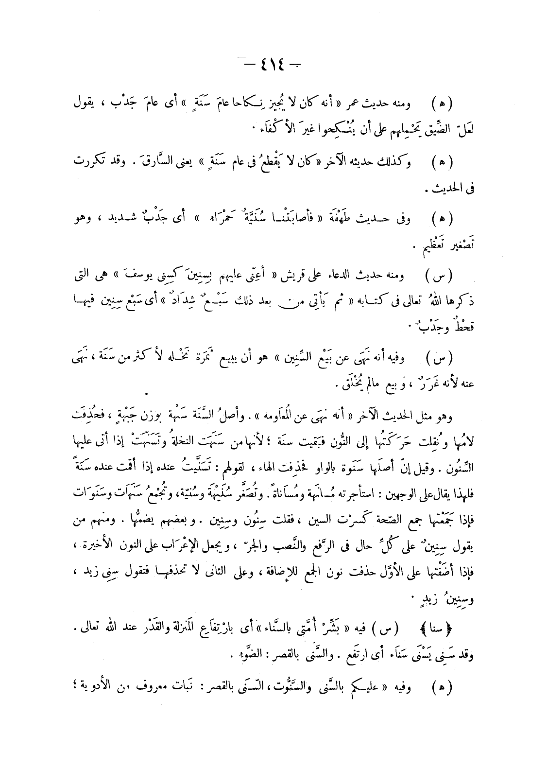 وَهُوَ مِثْلُ الْحَدِيثِ الْآخَرِ «أَنَّهُ نهَى عن المعاومة» . وأصل السَّنَةِ سَنْهَةٌ بِوَزْنِ جَبْهةٍ، فحُذِفَت لامُها ونُقِلت حَرَكَتُها إِلَى النُّون فبَقيت سَنَة؛ لِأَنَّهَا مِنْ سَنَهَتِ النخلةُ وتَسَنَّهَتْ إِذَا أَتَى عَلَيْهَا السِّنُون. وَقِيلَ إِنَّ أَصْلَهَا سَنَوَةٌ بِالْوَاوِ فَحُذِفَتِ الْهَاءُ، لِقَوْلِهِمْ: تَسَنَّيتُ عِنْدَهُ إِذَا أَقَمْتُ عِنْدَهُ سَنَةً فَلِهَذَا يُقَالُ عَلَى الْوَجْهَيْنِ: اسْتَأْجَرْتُهُ مُسَانَهَة ومُساَناةً. وتُصَغَّر سُنَيْهَة وسُنيّة، وتُجْمعُ سَنَهَات وسَنَوَات فَإِذَا جَمَعْتها جَمْعَ الصِّحَّةِ كَسْرت السِّينَ، فَقُلْتَ سِنُون وسِنِين. وَبَعْضُهُمْ يضمُّها. وَمِنْهُمْ مَنْ يَقُولُ سِنِينٌ عَلَى كُلِّ حَالٍ فِي الرَّفع والنَّصب وَالْجَرِّ، وَيَجْعَلُ الإعْرّاب عَلَى النُّونِ الْأَخِيرَةِ، فَإِذَا أضَفْتها عَلَى الأوَّل حَذَفْتَ نُونَ الْجَمْعِ لِلْإِضَافَةِ، وَعَلَى الثَّانِي لَا تَحْذِفْهَا فَتَقُولُ سِنِي زَيْدٍ، وسِنِينُ زيدٍ.
