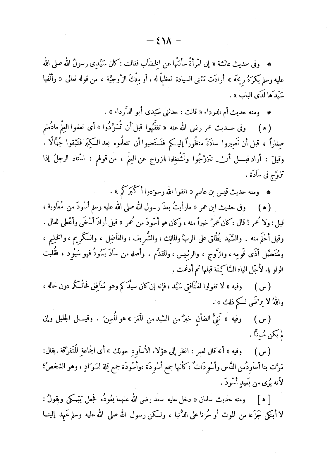 وَفِي حَدِيثِ عَائِشَةَ «إِنَّ امْرأةً سألتْها عَنِ الخِضاَب فَقَالَتْ: كَانَ سَيِّدِي رسولُ اللَّهِ صَلَّى اللَّهُ عَلَيْهِ وَسَلَّمَ يكرَهُ رِيحَه» أرادَت مَعْنى السِّيَادَةِ تَعْظِيمًا لَهُ، أَوْ مِلْك الزَّوجيَّة، مِنْ قوله تعالى وَأَلْفَيا سَيِّدَها لَدَى الْبابِ.