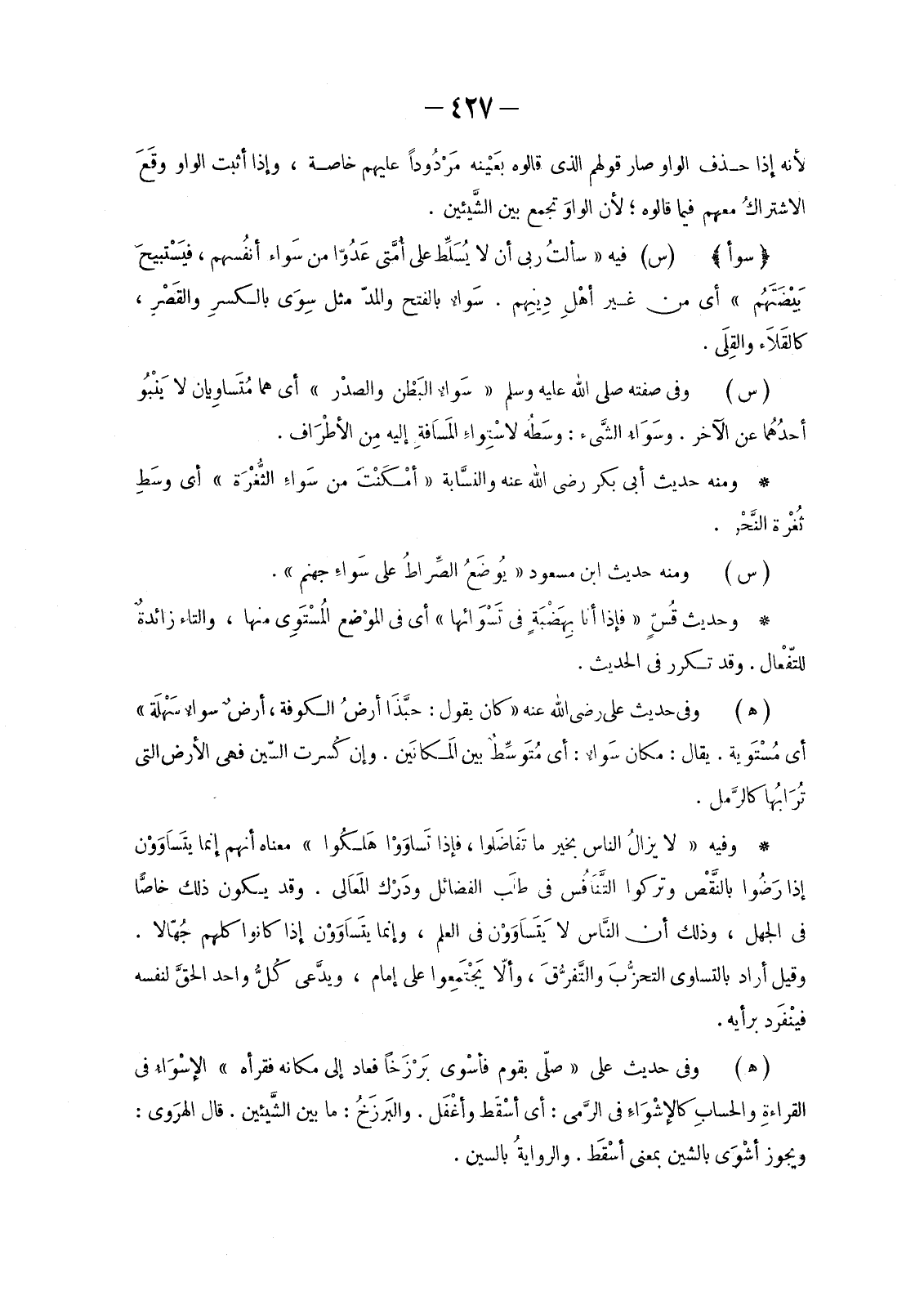 (س) وَفِي صِفَتِهِ صَلَّى اللَّهُ عَلَيْهِ وَسَلَّمَ «سَوَاءُ البَطْن والصدْر» أَيْ هُمَا مُتَساوِيان لَا يَنْبُو أحدُهُما عَنِ الْآخَرِ. وسَوَاءُ الشَّيء: وسَطُه لاسْتِواءِ المَساَفةِ إِلَيْهِ مِن الأطْرَاف.