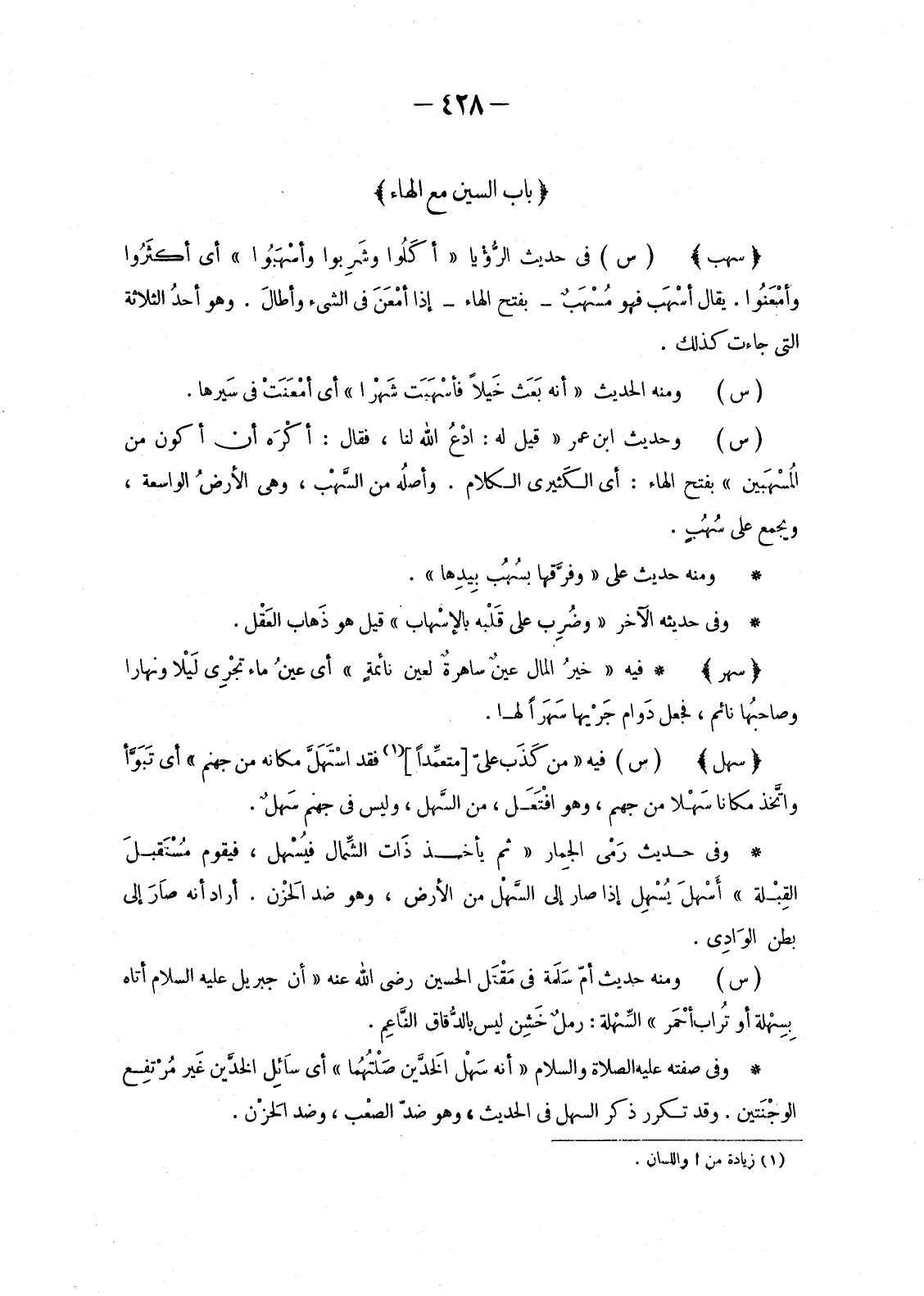 (س) وَحَدِيثُ ابْنِ عُمَرَ «قِيلَ لَهُ: ادْعُ اللَّهَ لَنَا، فَقَالَ: أكْرَه أَنْ أَكُونَ مِنَ الْمُسْهَبِينَ» بِفَتْحِ الْهَاءِ: أَيِ الكَثيري الْكَلَامِ. وأصلُه مِنَ السَّهْبِ، وَهِيَ الأرضُ الْوَاسِعَةُ، وَيُجْمَعُ عَلَى سُهُبٍ.