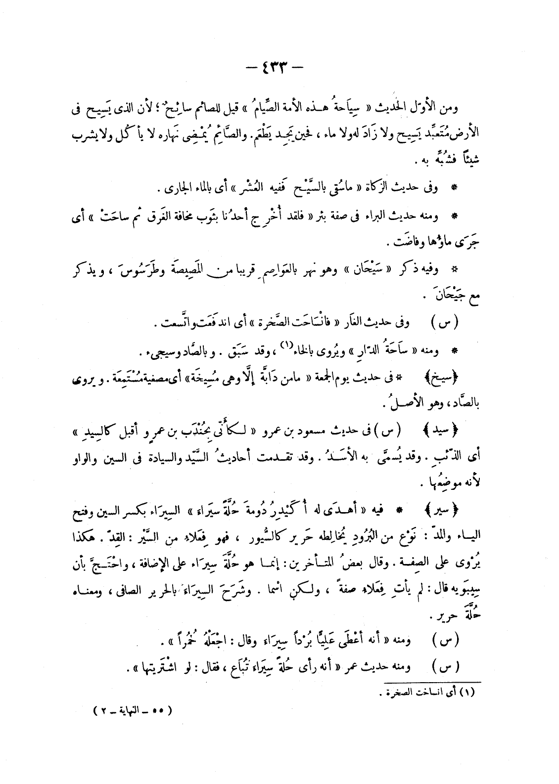 وَمِنَ الْأَوَّلِ الْحَدِيثُ «سِيَاحَةُ هَذِهِ الْأُمَّةِ الصِّيامُ» قِيلَ لِلصَّائِمِ سَائِحٌ؛ لِأَنَّ الَّذِي يَسِيحُ فِي الْأَرْضِ مُتَعبِّد يَسِيحُ وَلَا زَادَ لَهُ وَلَا مَاءَ، فَحِينَ يَجِد يَطْعَم. والصَّائِم يُمْضِي نَهاره لَا يأكُل وَلَا يَشْرَبُ شَيْئًا فشُبِّه بِهِ.