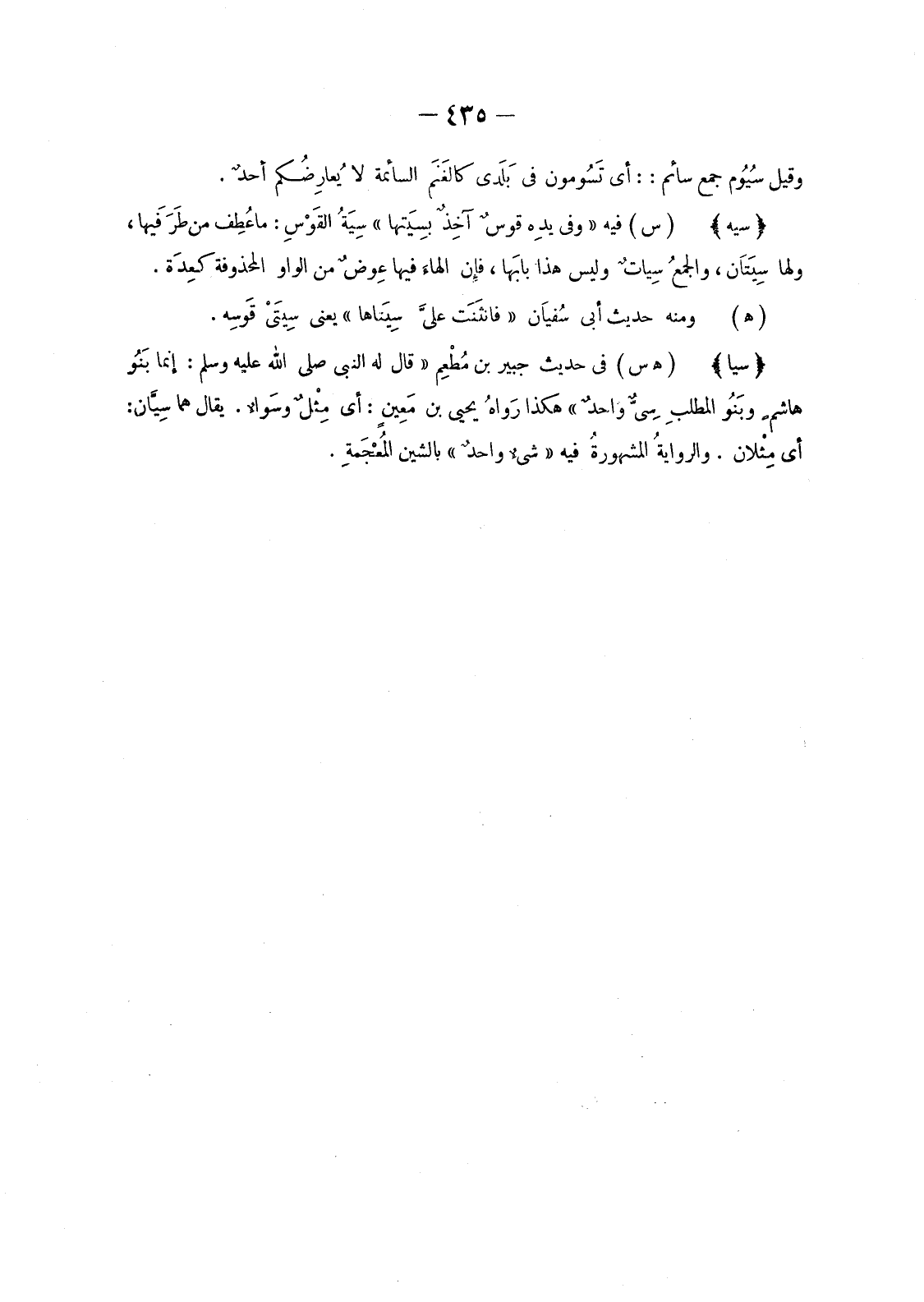 (هـ س) فِي حَدِيثِ جُبَيْر بْنِ مُطْعِم «قَالَ لَهُ النَّبِيُّ صَلَّى اللَّهُ عَلَيْهِ وَسَلَّمَ: إِنَّمَا بَنُو هاشمِ وبَنُو المطلبِ سِيٌّ واحدٌ» هَكَذَا رَواهُ يَحْيَى بْنُ مَعِينٍ: أَيْ مِثْلٌ وسَواءٌ. يُقَالُ هُمَا سِيَّانِ: