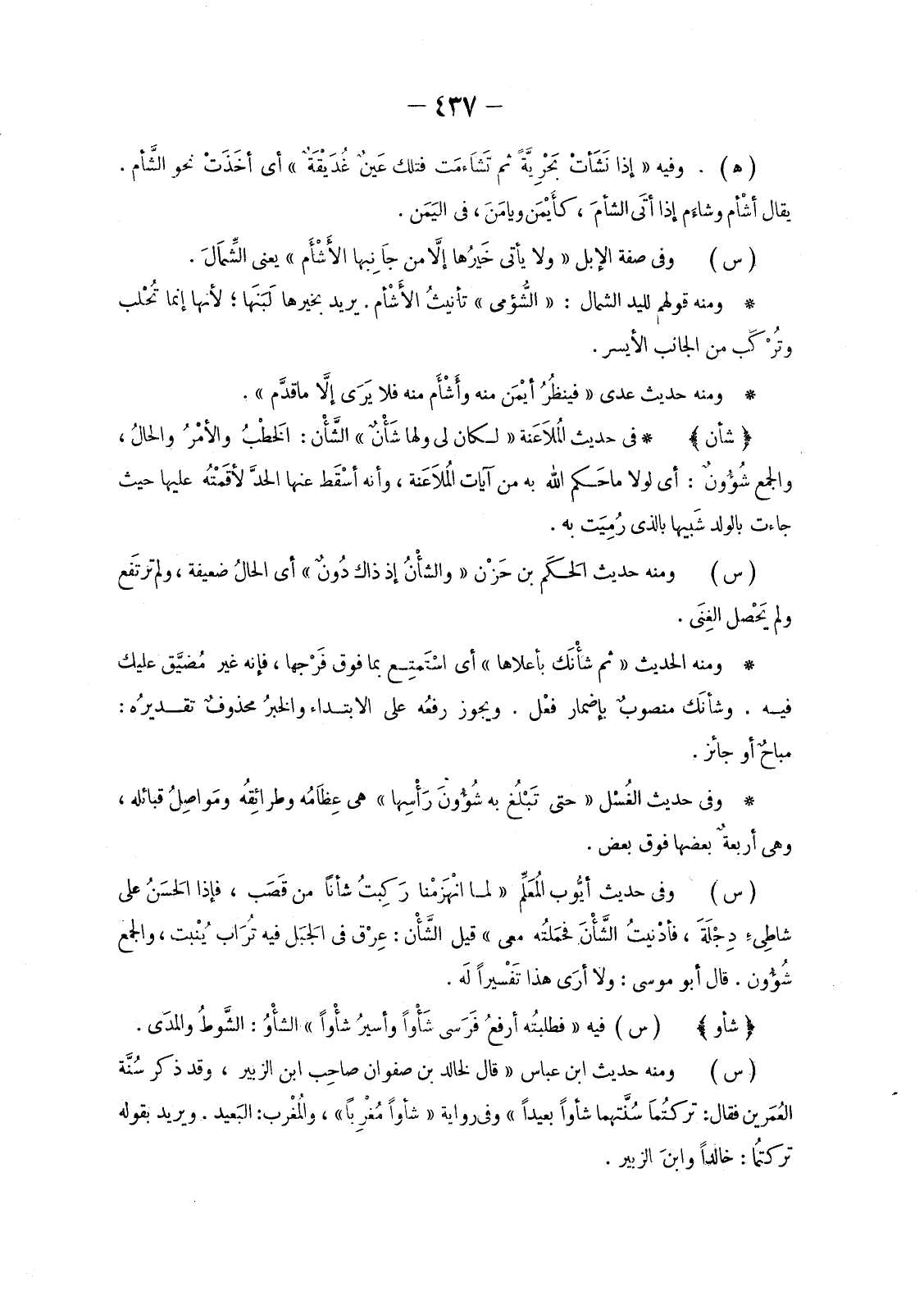 فِي حَدِيثِ المُلاَعَنة «لَكَانَ لِي وَلَهَا شَأْنٌ» الشَّأْنُ: الْخَطْبُ وَالْأَمْرُ وَالْحَالُ، وَالْجَمْعُ شُئُونٌ: أَيْ لَوْلَا مَا حَكم اللَّهُ بِهِ مِنْ آيَاتِ المُلاعَنَة، وَأَنَّهُ أسْقَط عَنْهَا الحدَّ لأقَمْتُه عَلَيْهَا حَيْثُ جَاءَتْ بِالْوَلَدِ شَبيها بِالَّذِي رُمِيَت بِهِ.