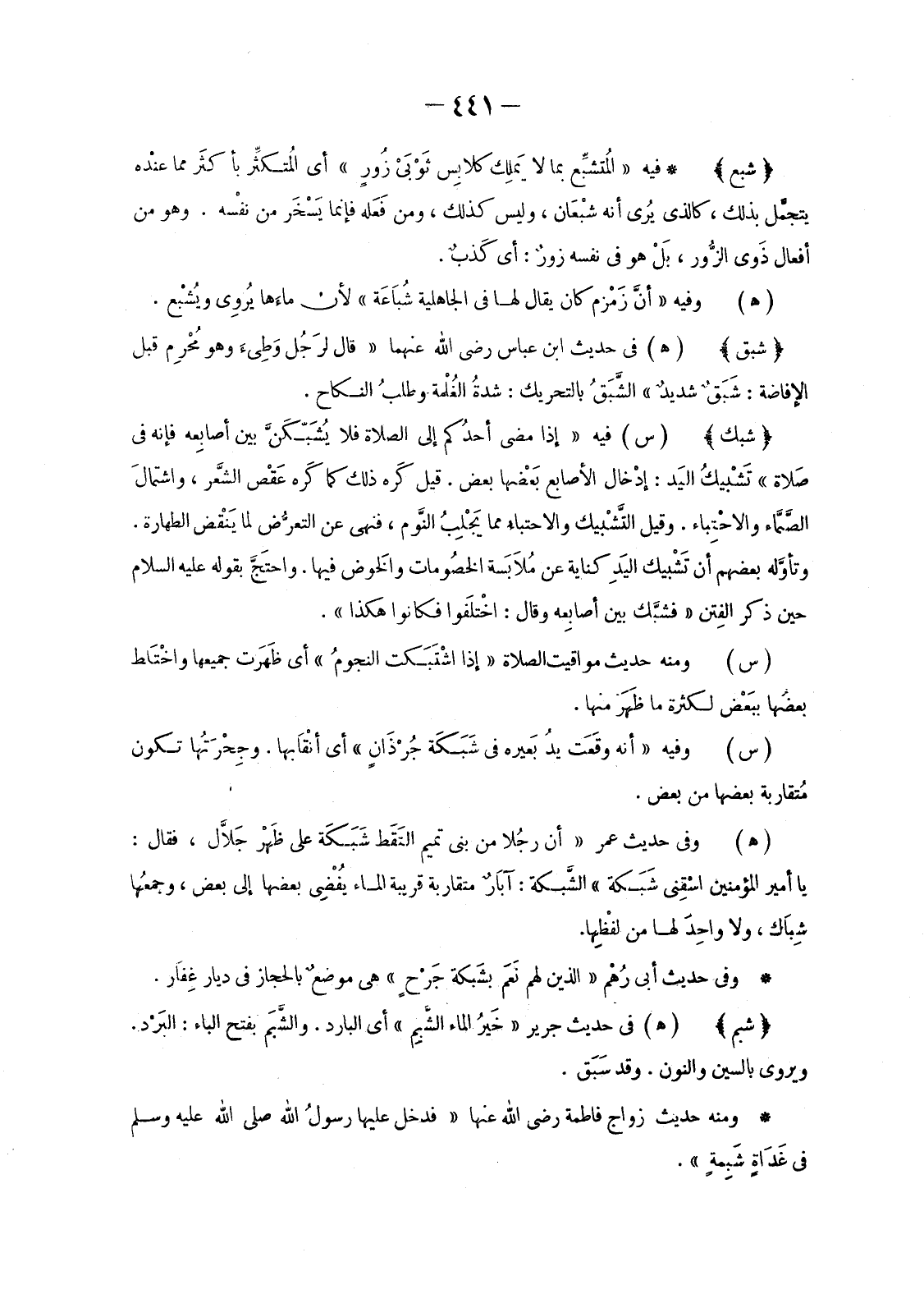 وتأوَّله بَعْضُهُمْ أَنَّ تَشْبِيكَ اليَدِ كِنَايَةٌ عَنْ مُلاَبَسة الخصُومات والخَوض فِيهَا. واحتَجَّ بِقَوْلِهِ عَلَيْهِ السَّلَامُ حِينَ ذَكَرَ الفِتن «فَشَبَّكَ بَيْنَ أصابِعه وَقَالَ: اخْتلَفوا فَكَانُوا هَكَذَا» .