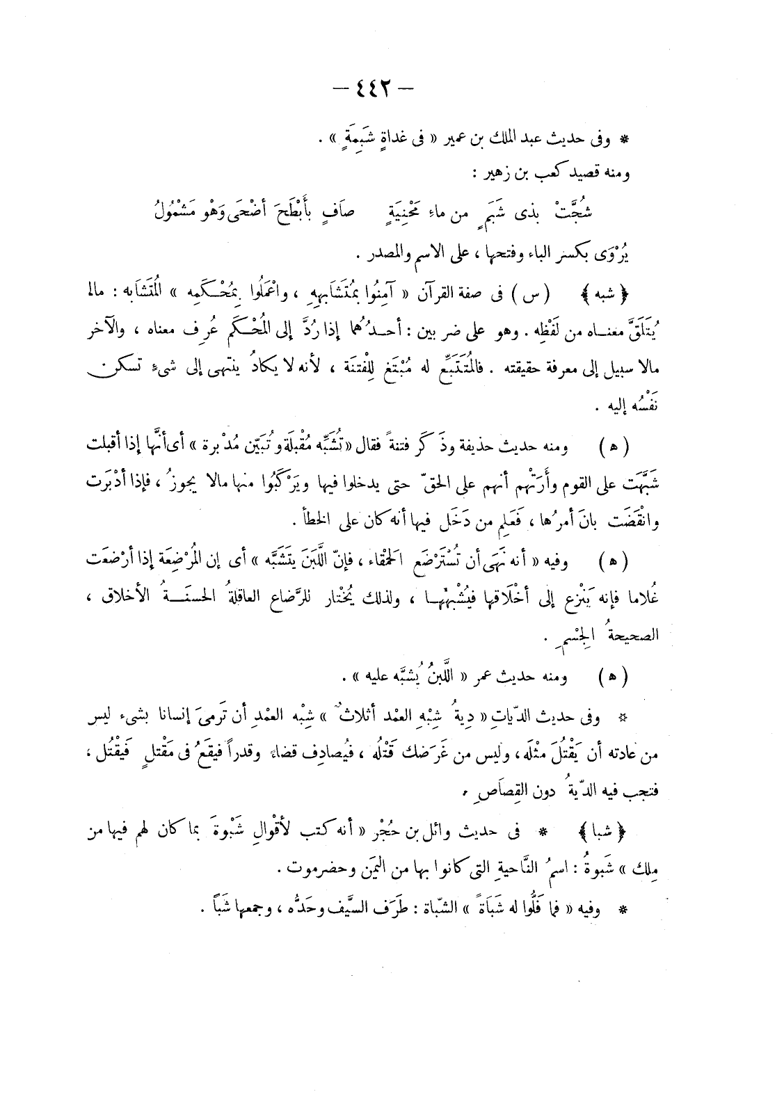 وَفِي حَدِيثِ الدّياتِ «دِيةُ شِبْهِ العمْد أثلاثٌ» شِبْهُ العمْدِ أَنْ تَرمىَ إِنْسَانًا بِشَيْءٍ لَيْسَ مِنْ عَادَتِهِ أَنْ يَقْتُلَ مثْلَه، وَلَيْسَ مِنْ غَرَضك قَتْلُه، فيُصادِف قَضَاءً وَقَدَرًا فيقَعُ فِي مَقْتلٍ فيقْتُل، فَتَجِبُ فِيهِ الدِّيةُ دُونَ القِصاَصِ.