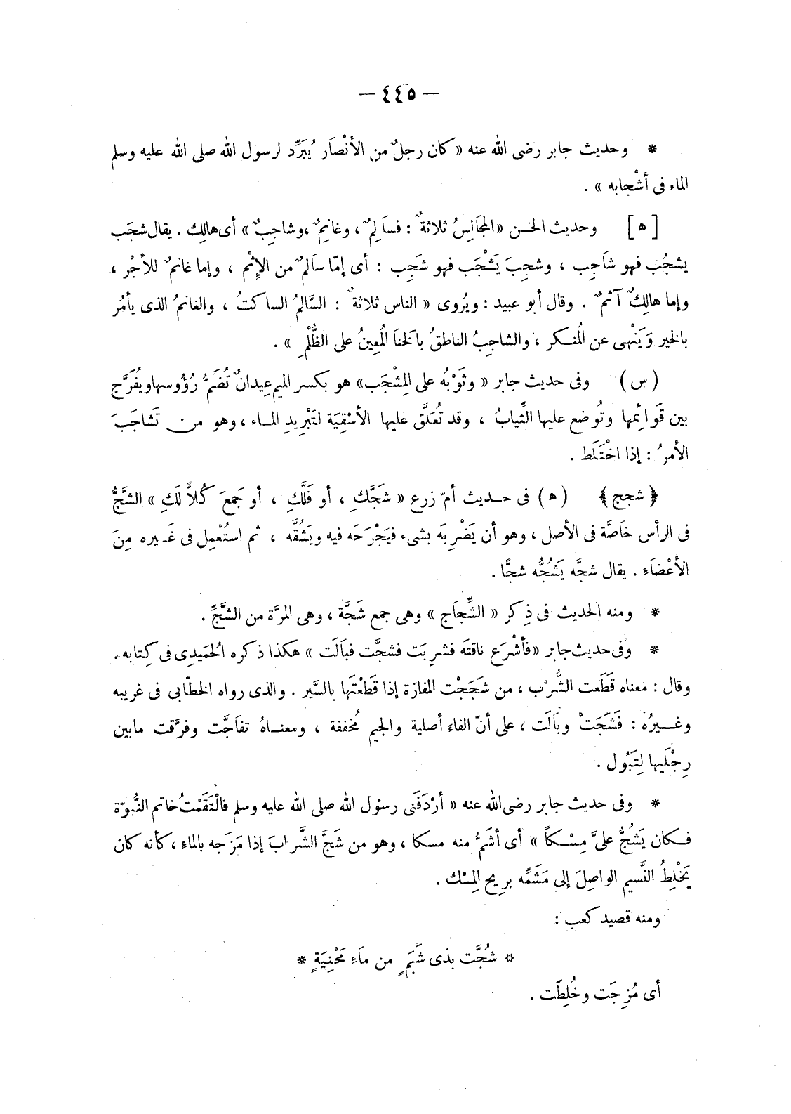 وَقَالَ: مَعْنَاهُ قَطَعت الشُّرْب، مِنْ شَجَجْتُ الْمَفَازَةَ إِذَا قَطْعتَها بالسَّير. وَالَّذِي رَوَاهُ الْخَطَّابِيُّ فِي غَرِيبِهِ وغيرُه: فَشَجَتْ وبَالُت، عَلَى أَنَّ الفاءَ أَصْلِيَّةٌ وَالْجِيمَ مُخففة، وَمَعْنَاهُ تفاَجَّت وفرَّقت مَا بَيْنَ رِجْلَيها لِتَبُول.