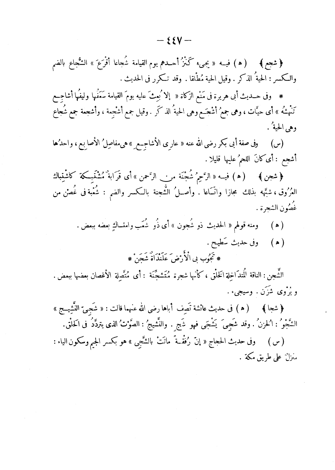 وَفِي حَدِيثِ أَبِي هُرَيْرَةَ فِي مَنْع الزَّكَاةِ «إِلَّا بُعِثَ عَلَيْهِ يومَ الْقِيَامَةِ سَعَفُها وليفُها أَشَاجِع تَنْهشُه» أَيْ حيَّات، وَهِيَ جمعُ أَشْجَعِ وَهِيَ الحيةُ الذكَر. وَقِيلَ جَمْعُ أَشْجِعَةٍ، وأَشْجِعَةٌ جَمْعُ شُجَاعٍ وَهِيَ الحيةُ.
