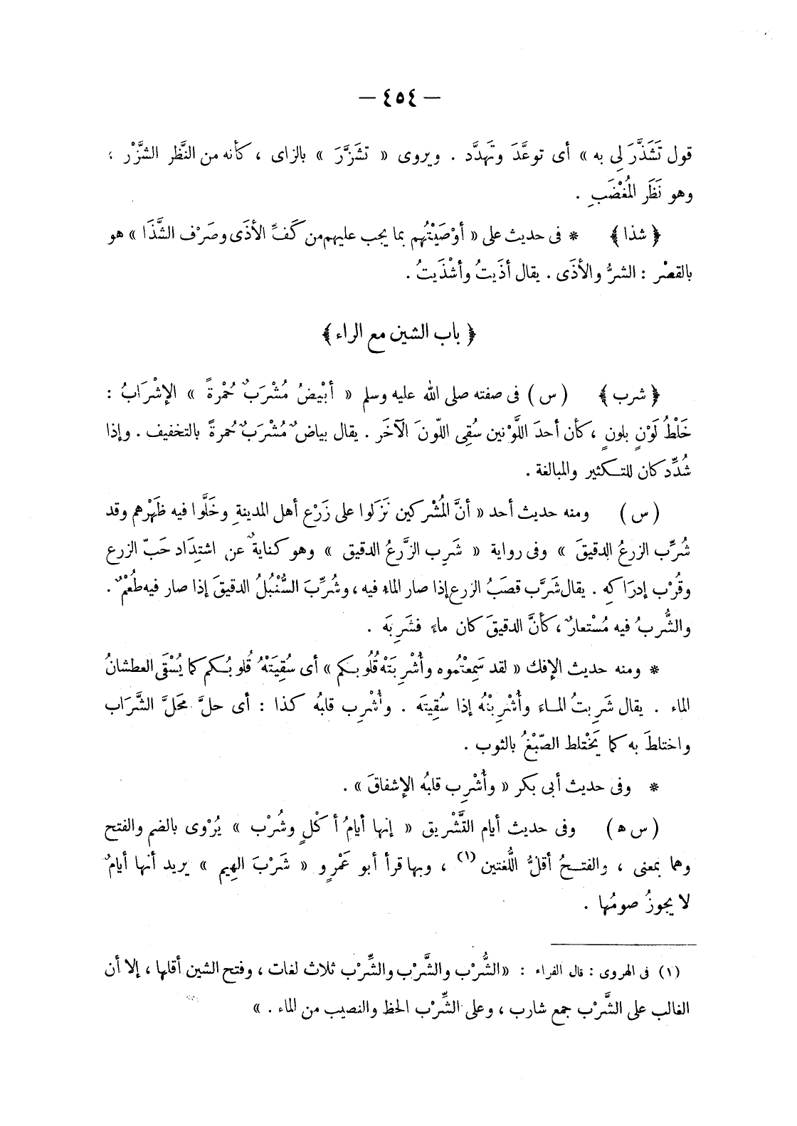(1) في الهروي: قال الفراء: «الشُّرْب والشَّرْب والشِّرْب ثلاث لغات، وفتح الشين أقلها، إلا أن الغالب على الشَّرْب جمع شارب، وعلى الشِّرْب الحظ والنصيب من الماء.»