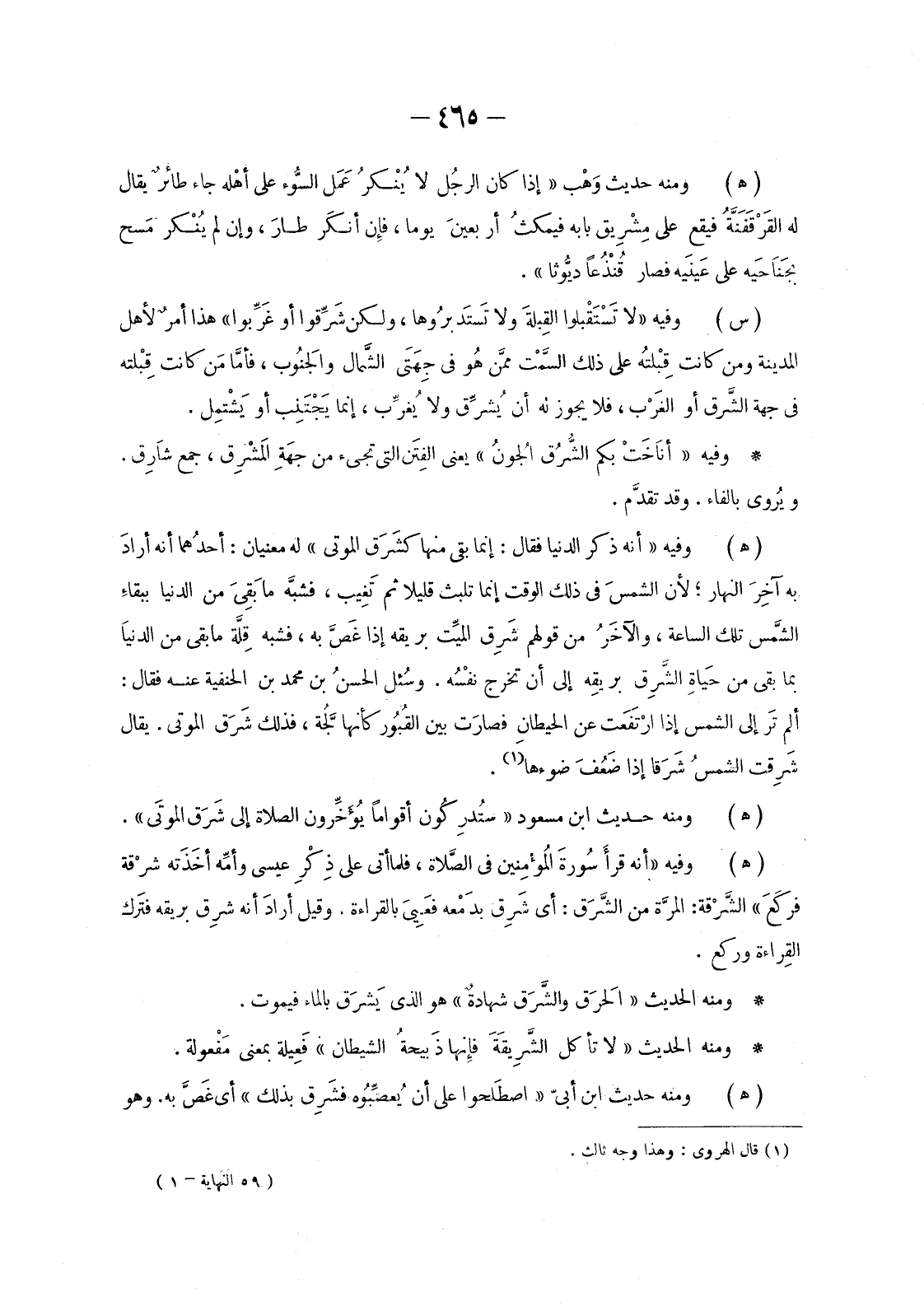 (هـ) وَفِيهِ «أَنَّهُ ذَكَرَ الدُّنْيَا فَقَالَ: إِنَّمَا بَقِيَ مِنْهَا كَشَرَقِ الْمَوْتَى» لَهُ مَعْنَيَانِ: أحدُهما أَنَّهُ أرادَ بِهِ آخِرَ النَّهَارِ؛ لِأَنَّ الشمسَ فِي ذَلِكَ الْوَقْتِ إِنَّمَا تَلْبَثُ قَلِيلًا ثُمَّ تَغِيب، فشبَّه مَا بَقِىَ مِنَ الدُّنْيَا ببقاءِ الشَّمس تِلْكَ السَّاعَةَ، والآخَرُ مِنْ قَوْلِهِمْ شَرِق الميِّت بِرِيقِهِ إِذَا غَصَّ بِهِ، فَشَبَّهَ قِلَّة مَا بَقِيَ مِنَ الدنياَ بِمَا بَقِيَ مِنْ حيَاةِ الشَّرِقِ بريقِه إِلَى أَنْ تَخْرُجَ نفْسُه. وسُئل الحسنُ بن محمد بن الْحَنَفِيَّةِ عَنْهُ فَقَالَ: