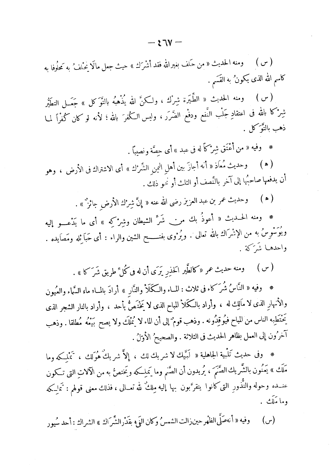 وَفِيهِ «النَّاسُ شُرَكَاء فِي ثَلَاثٍ: الْمَاءِ وَالْكَلَأِ والنَّارِ» أرادَ بالماءِ ماءَ السَّماء والعُيون والأنهارِ الَّذِي لَا ماَلِك لَهُ، وَأَرَادَ بالكَلأ الْمُبَاحِ الَّذِي لَا يَخْتَصُّ بِأَحَدٍ، وَأَرَادَ بِالنَّارِ الشَّجَرَ الَّذِي يَحْتَطِبه النَّاسُ مِنَ الْمُبَاحِ فيُوقِدُونه. وَذَهَبَ قومٌ إِلَى أَنَّ الْمَاءَ لَا يُمْلَك وَلَا يَصِحُّ بَيْعُه مُطلقا. وَذَهَبَ آخرُون إِلَى الْعَمَلِ بِظَاهِرِ الْحَدِيثِ فِي الثَّلَاثَةِ. والصحيحُ الأوّلُ.