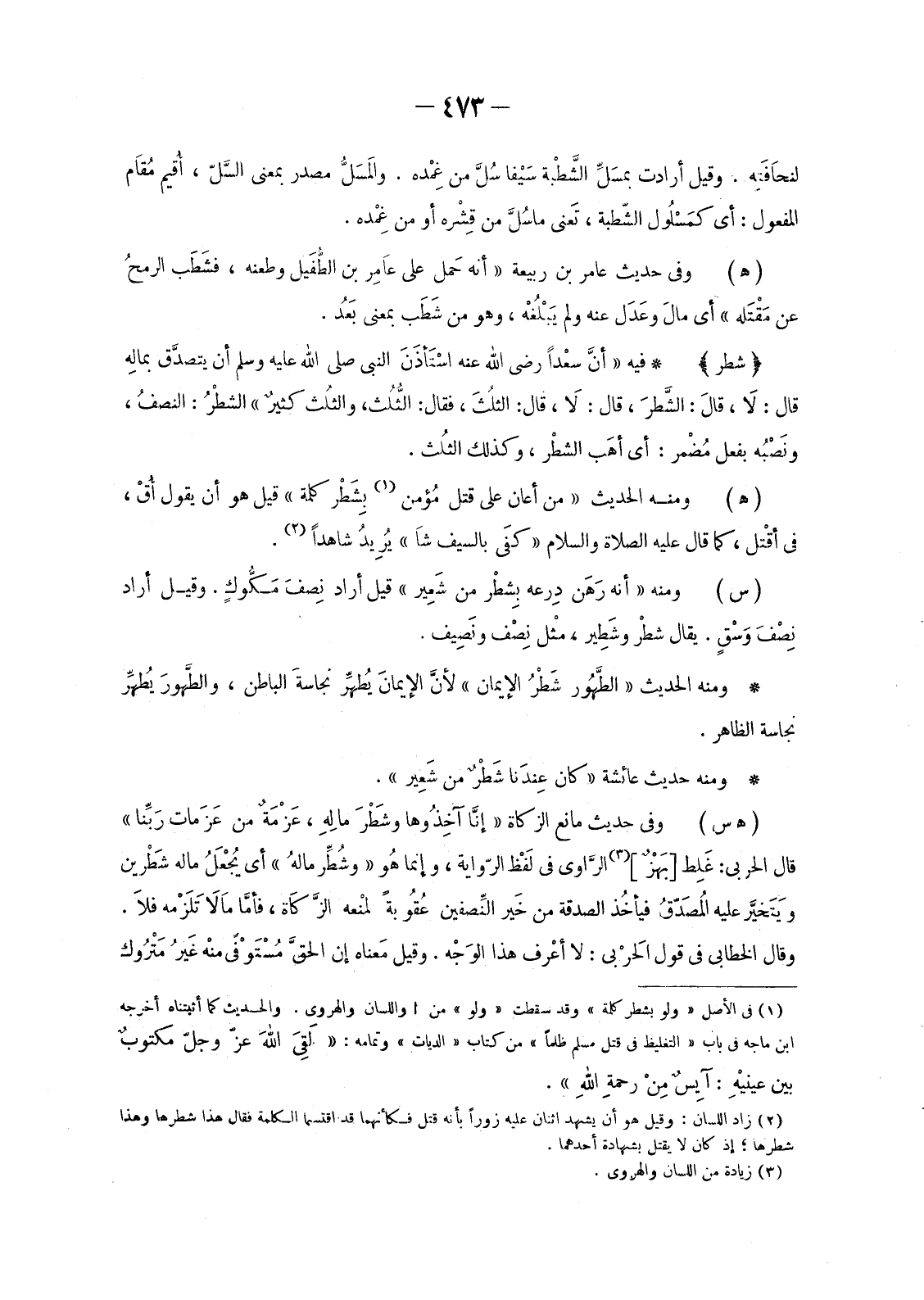 فِيهِ «أنَّ سْعداً رَضِيَ اللَّهُ عَنْهُ اسْتَأذَنَ النَّبِيَّ صَلَّى اللَّهُ عَلَيْهِ وَسَلَّمَ أَنْ يتصدَّق بمالِه قَالَ: لاَ، قالَ: الشَّطْرَ، قَالَ: لاَ، قَالَ: الثلُثَ، فَقَالَ: الثُّلُث، والثُلث كثيرٌ» الشَّطْرُ: النصفُ، ونَصْبُه بِفِعْلٍ مُضْمر: أَيْ أهَب الشَّطْرَ، وَكَذَلِكَ الثُلث.
