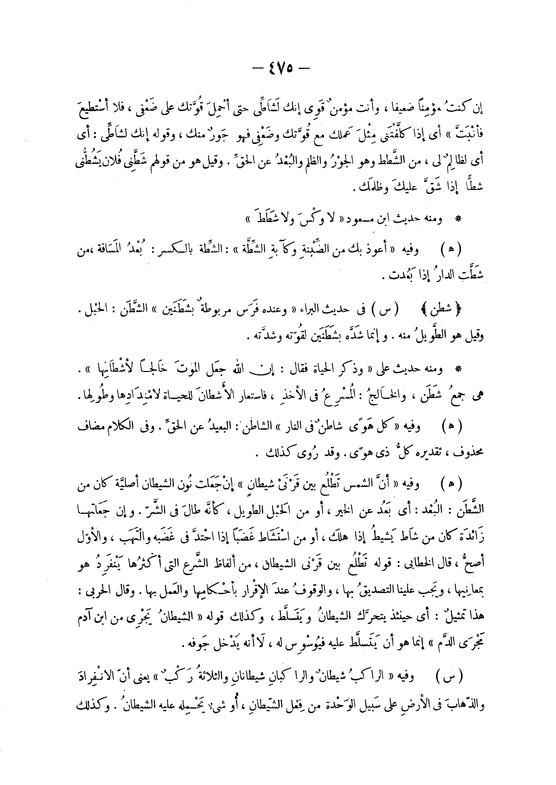 (هـ) وَفِيهِ «أنَّ الشَّمْسَ تَطْلُع بَيْنَ قَرْنَى شَيْطَانٍ» إنْ جَعَلت نُون الشَّيْطَانِ أصليَّة كَانَ مِنَ الشَّطَنِ: البُعْد: أَيْ بَعُد عَنِ الْخَيْرِ، أَوْ مِنَ الحَبْل الطَّوِيلِ، كأنَّه طالَ فِي الشَّرّ. وَإِنْ جَعَلتها زَائدَة كَانَ مِنْ شاَط يَشيطُ إِذَا هلَك، أَوْ مِنَ اسْتَشَاط غَضَباً إِذَا احْتدَّ فِي غَضَبه والْتَهَب، وَالْأَوَّلُ أصحُّ، قَالَ الْخَطَّابِيُّ: قَوْلُهُ تَطْلُع بَيْنَ قَرْني الشَّيْطَانِ، مِنْ أَلْفَاظِ الشَّرع الَّتِي أكثرُها يَنْفَردُ هُوَ بمعانِيها، ويجبُ عَلَيْنَا التَّصْدِيقُ بِهَا، والوقُوفُ عندَ الإقْرار بأحْكامِها والعَمل بِهَا. وَقَالَ الْحَرْبِيُّ: