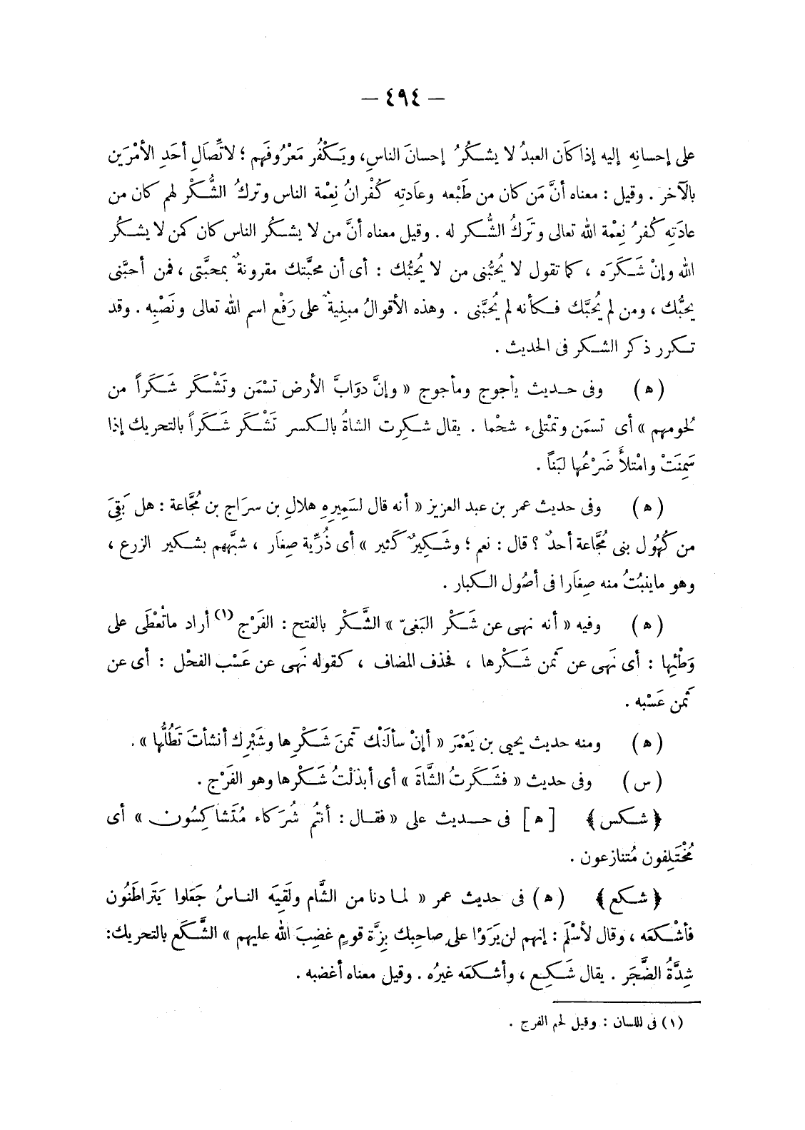 عَلَى إِحْسَانِهِ إِلَيْهِ إِذَا كَان العبدُ لَا يَشْكُرُ إحسانَ الناسِ، ويَكْفُر مَعْرُوفَهم؛ لأتِّصاَلِ أحَدِ الأمْرَين بِالْآخَرِ. وَقِيلَ: مَعْنَاهُ أنَّ مَن كَانَ مِنْ طَبْعه وعاَدِته كُفْرانُ نِعْمة النَّاسِ وتركُ الشُّكْر لَهُمْ كَانَ مِنْ عادَتِه كُفرُ نِعْمة اللَّهِ تَعَالَى وتَركُ الشُّكر لَهُ. وَقِيلَ مَعْنَاهُ أنَّ مَنْ لَا يشكُر النَّاسَ كَانَ كَمَنْ لَا يشكُر اللَّهَ وإنْ شَكَرَه، كَمَا تَقُولُ لَا يُحُّبني مَنْ لَا يُحبُّك: أَيْ أَنَّ محبَّتك مقرونةٌ بمحبَّتي، فَمَنْ أحبَّني يحبُّك، وَمَنْ لَمْ يَحبَّك فَكَأَنَّهُ لَمْ يُحبَّني. وَهَذِهِ الأقوالُ مبِنيةٌ عَلَى رَفْع اسْمِ اللَّهِ تَعَالَى ونَصْبِه. وَقَدْ تَكَرَّرَ ذِكْرُ الشُّكْرِ فِي الْحَدِيثِ.
