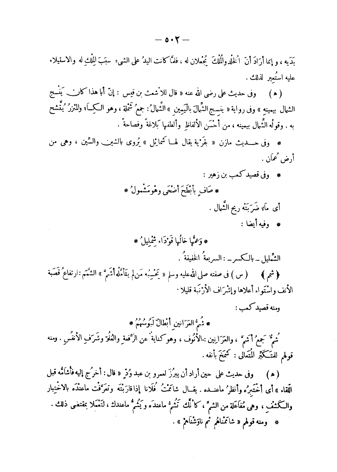 (هـ) وَفِي حَدِيثِ عَلِيٍّ رَضِيَ اللَّهُ عَنْهُ «قَالَ لِلْأَشْعَثِ بْنِ قَيْسٍ: إِنَّ أَبَا هَذَا كَانَ يَنْسج الشِّمَالُ بيمينهِ» وَفِي رِوَايَةٍ «ينِسج الشِّمَالَ بالْيَمِينِ» الشِّمَالُ: جمعُ شَمْلَةٍ، وَهُوَ الكِساَء والمئزرُ يُتَّشح بِهِ. وقولُه الشِّمال بِيَمِينِهِ، مِنْ أحْسَن الألفاظِ وَأَلْطَفِهَا بَلاغةً وَفَصَاحَةً.