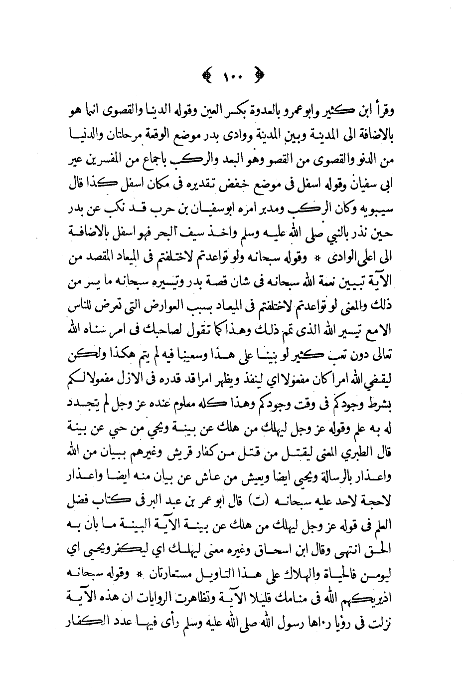 وقوله سبحانه ولو تواعدتم لاختلفتم في الميعاد المقصد من الآية تبيين نعمة الله سبحانه في شأن قصة بدر وتيسيره سبحانه ما يسر من ذلك والمعنى لو تواعدتم لاختلفتم في المعياد بسبب العوارض التي تعرض للناس إلا مع تيسير الله الذي تمم ذلك وهذا كما تقول لصاحبك في أمر سناه الله تعالى دون تعب كثير لو بنينا على هذا وسعينا فيه لم يتم هكذا ولكن ليقضي الله أمرا كان مفعولا أي لينفذ ويظهر أمرا قد قدره في الأزل مفعولا لكم بشرط وجودكم في وقت وجودكم وهذا كله معلوم عنده عز و جل لم يتجدد له به علم وقوله عز و جل ليهلك من هلك عن بينة ويحي من حي عن بينة قال الطبري المعنى ليقتل من قتل من كفار قريش وغيرهم ببيان من الله واعذار بالرسالة ويحكي أيضا ويعيش من عاش عن بيان منه أيضا وأعذرا لا حجة لأحد عليه سبحانه ت قال أبو عمر بن عبد البر في كتاب فضل العلم في قوله عز و جل ليهلك من هلك عن بينة الآية البينة ما بان به الحق انتهى وقال ابن إسحاق وغيره معنى ليهلك أي ليكفر ويحي أي ليؤمن فالحياة والهلاك على هذا التأويل مستعارتان