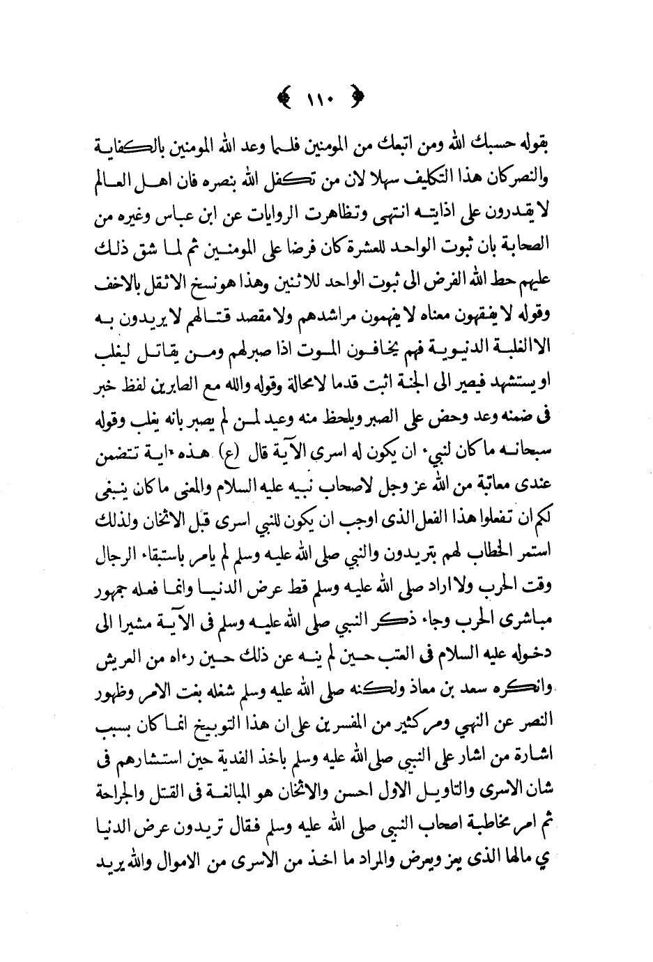 وقوله سبحانه ما كان لنبي أن يكون له أسرى الآية قال ع هذه آية تتضمن عندي معاتبة من الله عز و جل لأصحاب نبيه عليه السلام والمعنى ما كان ينبغي لكم أن تفعلوا هذا الفعل الذي أوجب أن يكون للنبي أسرى قبل الإثخان ولذلك استمر الخطاب لهم بتريدون والنبي صلى الله عليه و سلم لم يأمر باستبقاء الرجل وقت الحرب ولا أراد صلى الله عليه و سلم قط عرض الدنيا وإنما فعله جمهور مباشري الحرب وجاء ذكر النبي صلى الله عليه و سلم في الآية مشيرا إلى دخوله عليه السلام في العتب حين لم ينه عن ذلك حين رآه من العريش وأنكره سعد بن معاذا لكنه صلى الله عليه و سلم شغله بغت الأمر وظهور النصر عن النهي ومر كثير من المفسرين على أن هذا التوبيخ إنما كان بسبب إشارة من أشار على النبي صلى الله عليه و سلم بأخذ الفدية حين استشارهم في شأن الأسرى والتأويل الأول أحسن والإثخان هو المبالغة في القتل والجراحة ثم أمر مخاطبة أصحاب النبي صلى الله عليه و سلم فقال تريدون عرض الدنيا أي مالها الذي يعز ويعرض والمراد ما أخذ من الأسرى من الأموال والله يريد