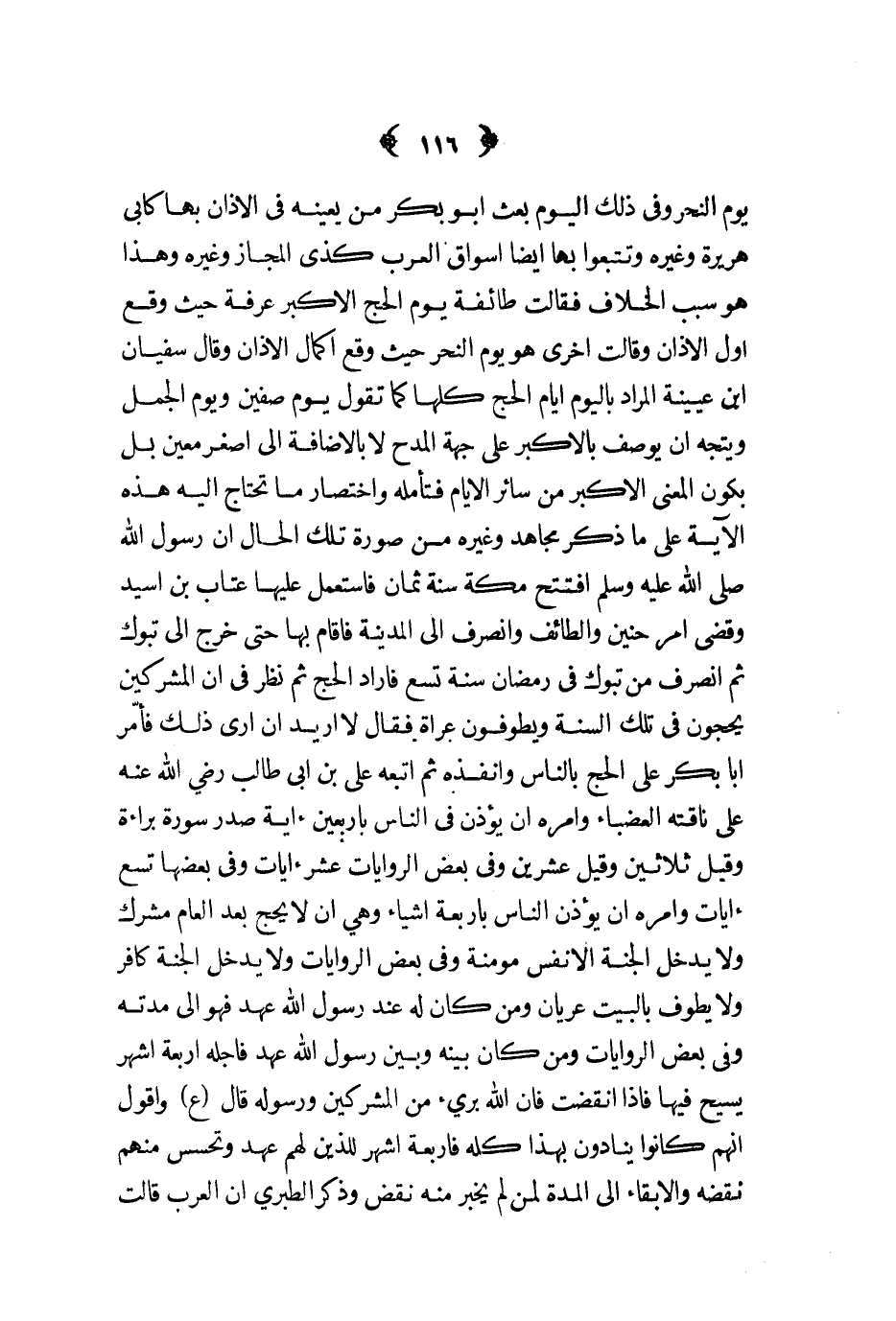 يوم النحر وفي ذلك اليوم بعث أبو بكر من يعينه في الاذان بها كأبي هريرة وغيره وتتبعوا بها أيضا أسواق العرب كذى المجاز وغيره وهذا هو سبب الخلاف فقالت طائفة يوم الحج الأكبر عرفة حيث وقع أو الاذان وقالت أخرى هو يوم النحر حيث وقع إكمال الاذان وقال سفيان ابن عيينة المراد باليوم أيام الحج كلها كما تقول يوم صفين ويوم الجمل ويتجه أن يوصف بالأكبر على جهة المدح لا بالإضافة إلى أصغر معين بل يكون المعنى الأكبر من سائر الأيام فتأمله واختصار ما تحتاج إليه هذه الآية على ما ذكر مجاهد وغيره من صورة تلك الحال أن رسول الله صلى الله عليه و سلم افتتح مكة سنة ثمان فاستعمل عليها عتاب بن أسيد وقضى أمر حنين والطائف وانصرف إلى المدينة فأقام بها حتى خرج إلى تبوك ثم أنصرف من تبوك في رمضان سنة تسع فأراد الحج ثم نظر في أن المشركين يحجون في تلك السنة ويطوفون عراة فقال لا أريد أن أرى ذلك فأمر أبا بكر على الحج بالناس وأنفذه ثم أتبعه علي بن أبي طالب رضي الله عنه على ناقته العضباء وأمره أن يؤذن في الناس بأربعين آية صدر صورة براءة وقيل ثلاثين وقيل عشرين وفي بعض الروايات عشر آيات وفي بعضها تسع آيات وأمره أن يؤذن الناس بأربعة أشياء وهي أن لا يحج بعد العام مشرك ولا يدخل الجنة إلا نفس مؤمنة وفي بعض الروايات ولا يدخل الجنة كافر ولا يطوف بالبيت عريان ومن كان له عند رسول الله عهد فهو إلى مدته وفي بعض الروايات ومن كان بينه وبين رسول الله عهد فأجله أربعة أشهر يسيح فيها فإذا انقضت فإن الله بريء من المشركين ورسوله قال ع وأقول أنهم كانوا ينادون بهذا كله فأربعة أشهر للذين لهم عهد وتحسس منهم نقضه والإبقاء إلى المدة لمن لم يخبر منه نقض وذكر الطبري أن العرب قالت