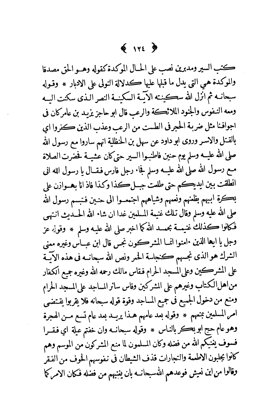وقوله سبحانه ثم أنزل الله سكينته الآية السكينة النصر الذي سكنت إليه ومعه النفوس والجنود الملائكة والرعب قال أبو حاجز يزيد بن عامر كان في أجوافنا مثل ضربة الحجر في الطست من الرعب وعذب الذين كفروا أي بالقتل والأسر وروى أبو داود عن سهل بن الحنظلية أنهم ساروا مع رسول الله صلى الله عليه و سلم يوم حنين فاطنبوا السير حتى كان عشية فحضرت الصلاة مع رسول الله صلى الله عليه و سلم فجاء رجل فارس فقال يا رسول الله إني انطلقت بين أيديكم حتى طلعت جبل كذا وكذا فإذ أنا بهوازن على بكرة أبيهم بظعنهم ونعمهم وشياههم اجتمعوا إلى حنين فتبسم رسول الله صلى الله عليه و سلم وقال تكل غنيمة المسلمين غدا إن شاء الله الحديث انتهى فكانوا كذلك غنيمة بحمد الله كما أخبر صلى الله عليه و سلم