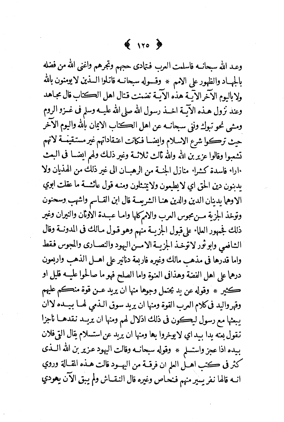 وقوله سبحانه قاتلوا الذين لا يؤمنون بالله ولا باليوم الآخر الآية هذه الآية تضمنت قتال أهل الكتاب قال مجاهد وعند نزول هذه الآية أخذ رسول الله صلى الله عليه و سلم في غزو الروم ومشى نحو تبوك ونفى سبحانه عن أهل الكتاب الإيمان بالله واليوم الآخر حيث تركوا شرع الإسلام وأيضا فكانت اعتقاداتهم غير مستقيمة لأنهم تشعبوا وقالوا عزير بن الله والله ثالث ثلاثة وغير ذلك ولهم أيضا في البعث آراء فاسدة كشراء منازل الجنة من الرهبان إلى غير لك من الهذيان ولا يدينون دين الحق أي لا يطيعون ولا يمتثلون ومنه قول عائشة ما عقلت أبوي إلا وهما يدينان الدين والدين هنا الشريعة قال ابن القاسم وأشهب وسحنون وتؤخذ الجزية من مجوس العرب والأمم كلها وأما عبدة الأوثان والنيران وغير ذلك فجمهور العلماء على قبول الجزية منهم وهو قول مالك في المدونة وقال الشافعي وأبو ثور لا تؤخذ الجزية إلا من اليهود والنصارى والمجوس فقط وأما قدرها في مذهب مالك وغيره فأربعة دنانير على أهل الذهب وأربعون درهما على أهل الفضة وهذا في العنوة وأما الصلح فهو ما صالحوا عليه قليل أو كثير