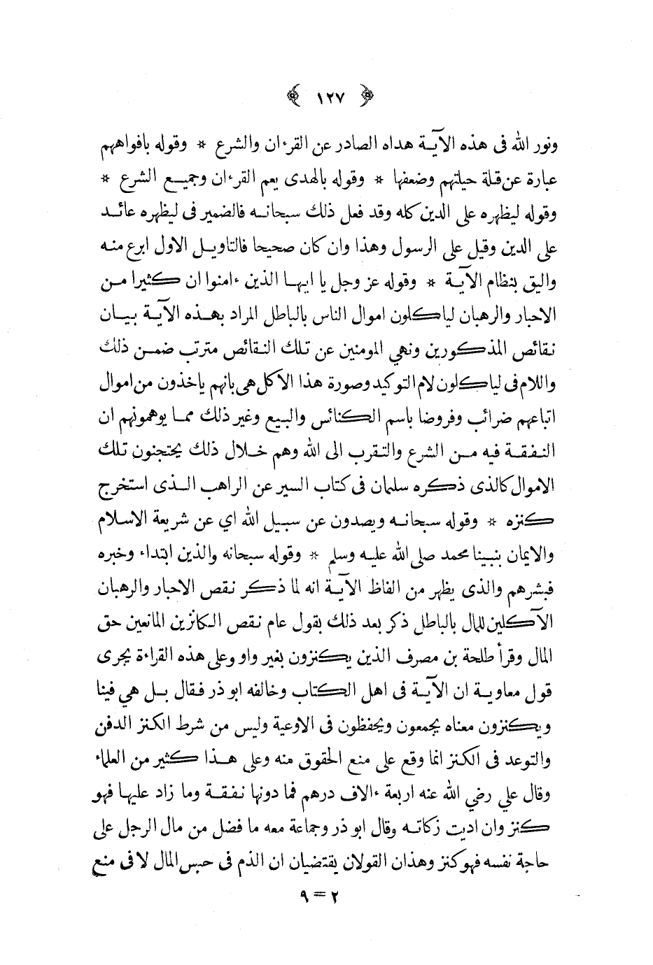 وقوله سبحانه والذين ابتداء وخبره فبشرهم والذي يظهر من ألفاظ الآية أنه لما ذكر نقص الأحبار والرهبان الآكلين للمال بالباطل ذكر بعد ذلك بقول عام نقص الكانزين المانعين حق المال وقرأ طلحة بن مصرف الذين يكنزون بغير واو وعلى هذه القراءة يجرى قول معاوية أن الآية في أهل الكتاب وخالفه أوب ذر فقال بل هي فينا ويكنزون معناه يجمعون ويحفظون في الأوعية وليس من شرط الكنز الدفن والتوعد في الكنز إنما وقع على منع الحقوق منه وعلى هذا كثير من العلماء وقال علي رضي الله عنه أربعة آلاف درهم فما دونهما نفقة وما زاد عليها فهو كنز وإن أديت زكاته وقال أبو ذر وجماعة معه ما فضل من مال الرجل على حاجة نفسه فهو كنز وهذان القولان يقتضيان أن الذم في حبس المال لا في منع