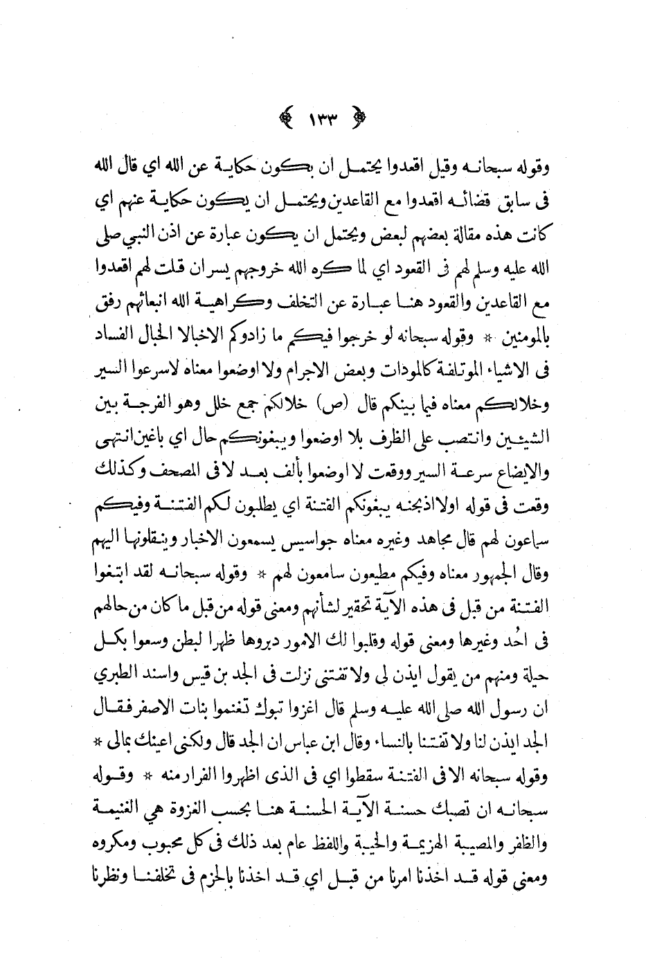 وقوله سبحانه لو خرجوا فيكم ما زادوكم إلا خبالا الخبال الفساد في والأشياء المؤتلفة كالمودات وبعض الإجرام ولا أوضعوا معناه لأسرعوا السير وخلالكم معناه فيما بينكم قال ص خلالكم جمع خلل وهو الفرجة بين الشيئين وانتصب على الظرف بلا أوضعوا ويبغونكم حال أي باغين انتهى والإيضاع سرعة السير ووقعت لاأوضعوا بألف بعد لا في المصحف وكذلك وقعت في قوله أولااذبحنه يبغونكم الفتنة أي يطلبون لكم الفتنة وفيكم سماعون لهم قال مجاهد وغيره معناه جواسيس يسمعون الأخبار وينقلونها إليهم وقال الجمهور معناه وفيكم مطيعون سامعون لهم