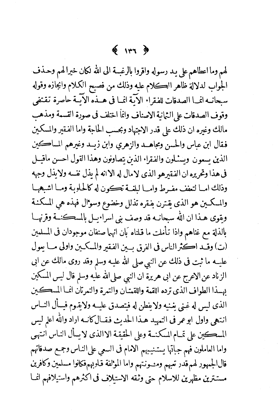 لهم وما أعطاهم على يد رسوله وأقروا بالرغبة إلى الله لكان خيرا لهم وحذف الجواب لدلالة ظاهر الكلام عليه وذلك من فصيح الكلام وإيجازه وقوله سبحانه إنما الصدقات للفقراء الآية إنما في هذه الآية حاصرة تقتضي وقوف الصدقات على الثمانية الأصناف وإنما اختلف في صورة القسمة ومذهب مالك وغيره أن ذلك على قدر الإحتهاد وبحسب الحاجة وأما الفقير والمسكين فقال ابن عباس والحسن ومجاهد والزهري وابن زيد وغيرهم المساكين الذين يسعون ويسئلون والفقراء الذين يتصاونون وهذا القول أحسن ما قيل في هذا تحريره أن الفقير هو الذي لا مال له إلا أنه لم يذل نفسه ولا يذل وجهه وذلك أما لتعفف مفرط وإما لبلغة تكون له كالحلوبة وما أشبهها والمسكين هو الذي يقترن بفقره تذلل وخضوع وسؤال فهذه هي المسكنة ويقوى هذا أن الله سبحانه قد وصف بني إسرائيل بالمسكنة وقرنها بالذلة مع غناهم وإذا تأملت ما قلناه بأن أنهما صنفان موجودان في المسلمين ت وقد أكثر الناس في الفرق بين الفقير والمسكين وأولى ما يعول عليه ما ثبت في ذلك عن النبي صلى الله عليه و سلم وقد روى مالك عن أبي الزناد عن الأعرج عن أبي هريرة أن النبي صلى الله عليه و سلم قال ليس المسكين بهذا الطواف الذي ترده اللقمة واللقمتان والتمرة والتمرتان إنما المسكين الذي ليس له غنى بغنيه ولا يفطن له فيتصدق عليه ولا يقوم فيسأل الناس انتهى وأول أبو عمر في التمهيد هذا الحديث فقال كأنه أراد والله أعلم ليس المسكين على تمام المسكنة وعلى الحقيقة إلا الذي لا يسأل الناس انتهى وأما العاملون فهم جباتها يستنيبهم الإمام في السعي على الناس وجمع صدقاتهم قال الجمهور لهم قدر تعبهم ومئسونتهم وأما المؤلفة قلوبهم فكانوا مسلمين وكافرين مستترين مظهرين للإسلام حتى وثقه الإستيلاف في أكثرهم واستيلافهم إنما