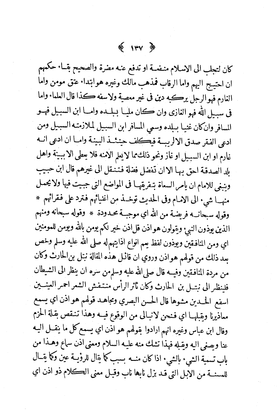 كان لتجلب إلى الإسلام منفعة أو تدفع عنه مضرة والصحيح بقاء حكمهم إن احتيج إليهم وأما الرقاب فمذهب مالك وغيره هو ابتداء عتق مؤمن وأما الغارم فهو الرجل يركبه دين في غير معصية ولا سفه كذا قال العلماء وأما في سبيل الله فهو الغازي وإن كان مليا ببلده وأما ابن السبيل فهو المسافر وإن كان غنيا ببلده وسمي المسافر ابن السبيل لملازمته السبيل ومن ادعى الفقر صدق إلا لويبة فيكلف حينئذ البينة وأما إن أدعى أنه غارم أو ابن السبيل أو غاز ونحو ذلك مما لا يعلم إلا منه فلا يعطي إلا ببينه وأهل بلد الصدقة أحق بها إلا أن تفضل فضلة فتنقل إلى غيرهم قال ابن حبيب وينبغي للامام أن يأمر السعاة بتفريقها في المواضع التي جبيت فيها ولا يحمل منها شيء إلا الإمام وفي الحديث تؤخذ من أغنيائهم فترد على فقرائهم