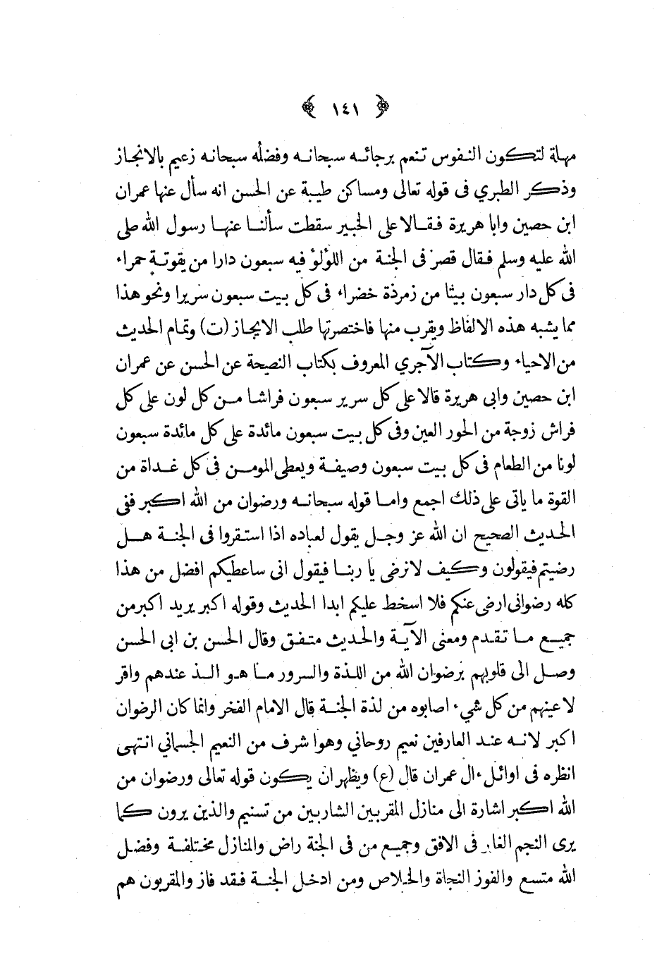مهلة لتكون النفوس تنعم برجائه سبحانه وفضله سبحانه زعيم بالإنجاز وذكر الطبري في قوله تعالى ومساكن طيبة عن الحسن أنه سأل عنها عمران ابن حصين وأبا هريرة فقالا على الخبير سقطت سألنا عنها رسول الله صلى الله عليه و سلم فقال قصر في الجنة من اللؤلؤ فيه سبعون دارا من يقوته حمراء في كل دار سبعون بيتا من زمردة خضراء في كل بيت سبعون سريرا ونحو هذا مما يشبه هذه الألفاظ ويقرب منها فاختصرتها طلب الإيجاز ت وتمام الحديث من الأحياء وكتاب الآجري المعروف بكتاب النصيحة عن الحسن عن عمران ابن حصين وأبي هريرة قالا على كل سرير سبعون فراشا من كل لون على كل فراش زوجة من الحور العين وفي كل بيت سبعون مائدة على كل مائدة سبعون لونا من الطعام في كل بيت سبعون وصيفة ويعطى المؤمن في كل غداة من القوة ما يأتي على ذلك أجمع وأما قوله سبحانه ورضوان من الله أكبر ففي الحديث الصحيح أن الله عز و جل يقول لعباده إذا استقروا في الجنة هل رضيتم فيقولون وكيف لا نرضى يا ربنا فيقول أني سأعطيكم أفضل من هذا كله رضواني أرضي عنكم فلا أسخط عليكم أبدا الحديث وقوله أكبر يريد أكبر من جميع ما تقدم ومعنى الآية والحديث متفق وقال الحسن بن أبي الحسن وصل إلى قلوبهم برضوان الله من اللذة والسرور ما هو ألذ عندهم وأقر لأعينهم من كل شيء أصابوه من لذة الجنة قال الإمام الفخر وإنما كان الرضوان أكبر لأنه عند العارفين نعيم روحاني وهو أشرف من النعيم الجسماني انتهى أنظره في أوائل آل عمران قال ع ويظهر أن يكون قوله تعالى ورضوان من الله أكبر إشارة إلى منازل المقربين الشاربين من تسنيم والذين يرون كما يرى النجم الغار في الأفق وجميع من في الجنة راض والمنازل مختلفة وفضل الله متسع والفوز النجاة والخلاص ومن أدخل الجنة فقد فاز والمقربون هم